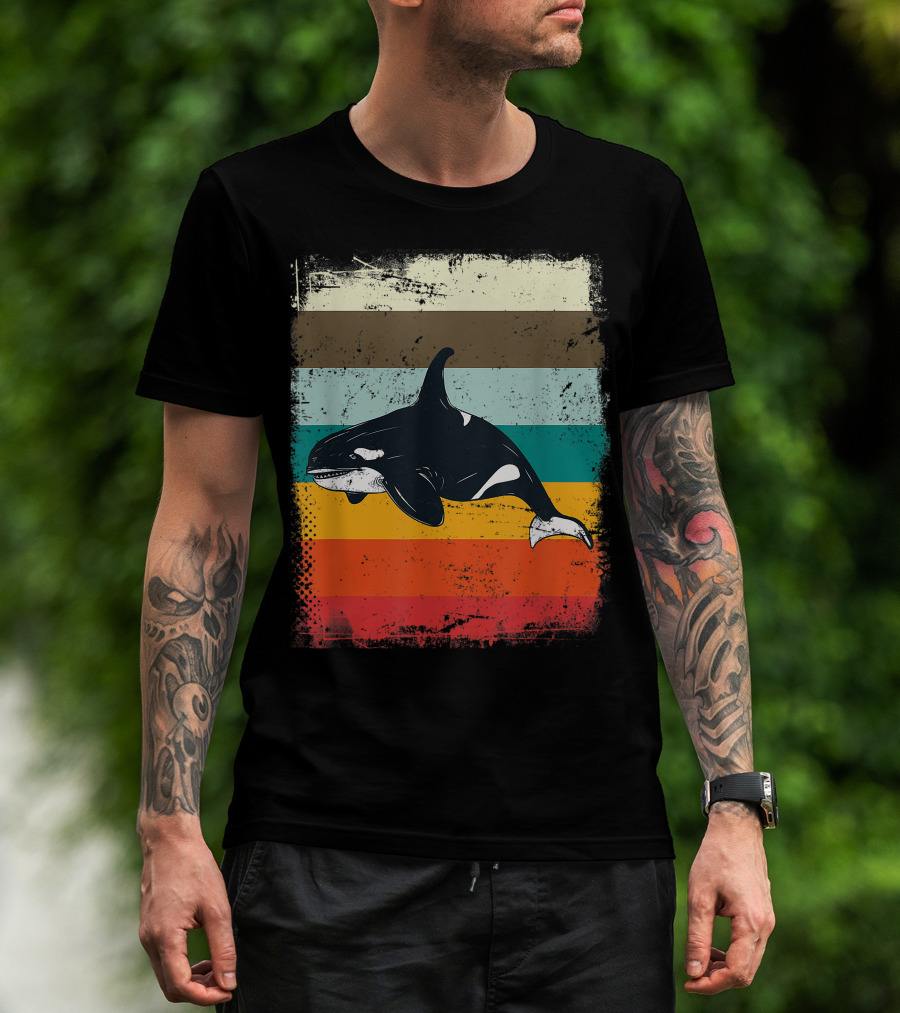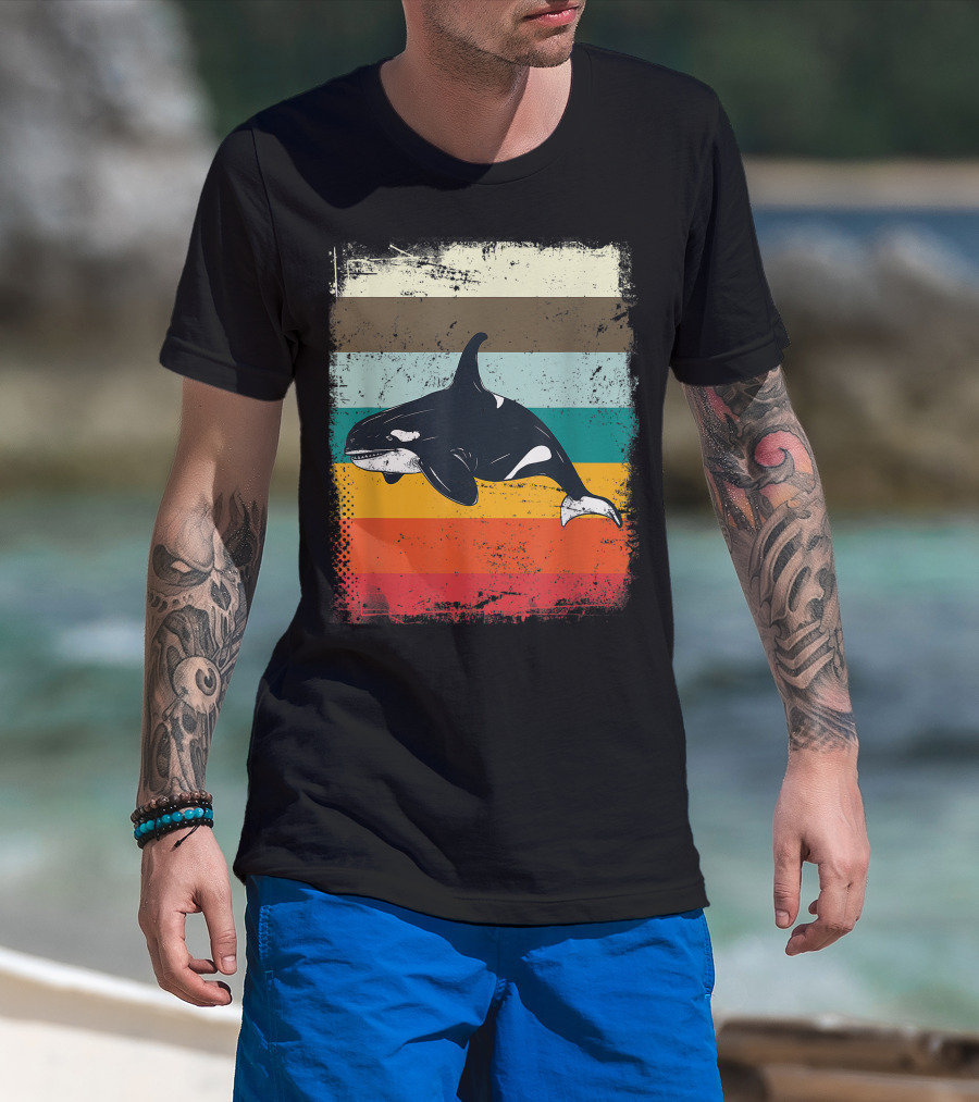 The Retro Orca Vintage Stripes T-shirt is designed for everyday wear and a consistent fit. Fabric is pre-shrunk ring-spun cotton with durable stitching. See the size chart below for exact measurements.