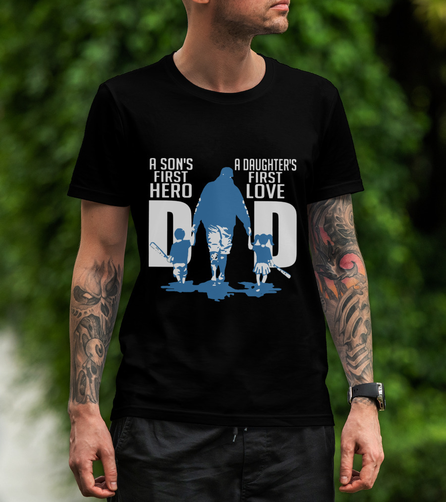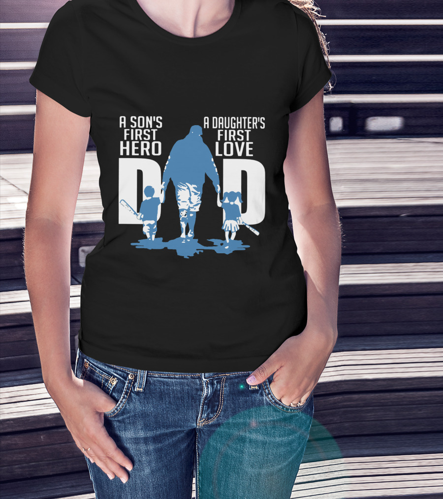 The Dad A Son's First Hero A Daughter's First Love Blue Silhouette with Kids and Baseball Bats T-shirt is designed for everyday wear and a consistent fit. Fabric is pre-shrunk ring-spun cotton with durable stitching. See the size chart below for exact measurements.