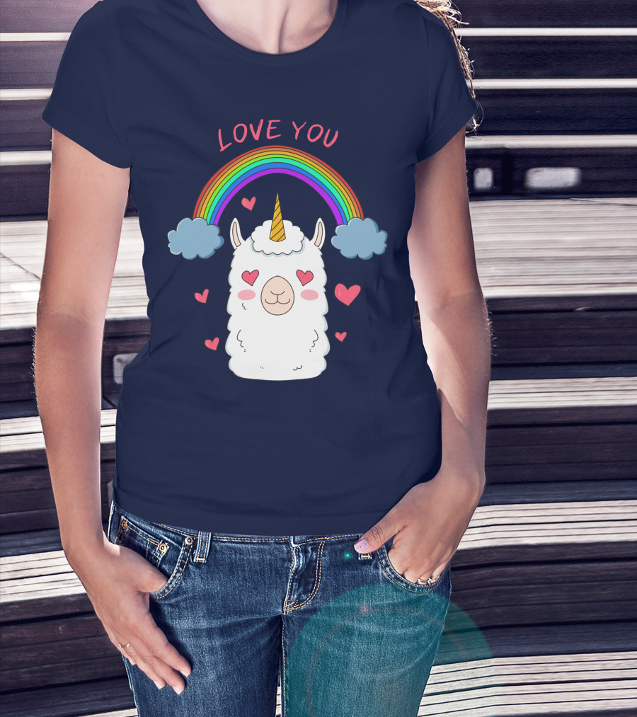Love You Alpaca Unicorn Rainbow Cloud Hearts T-Shirt