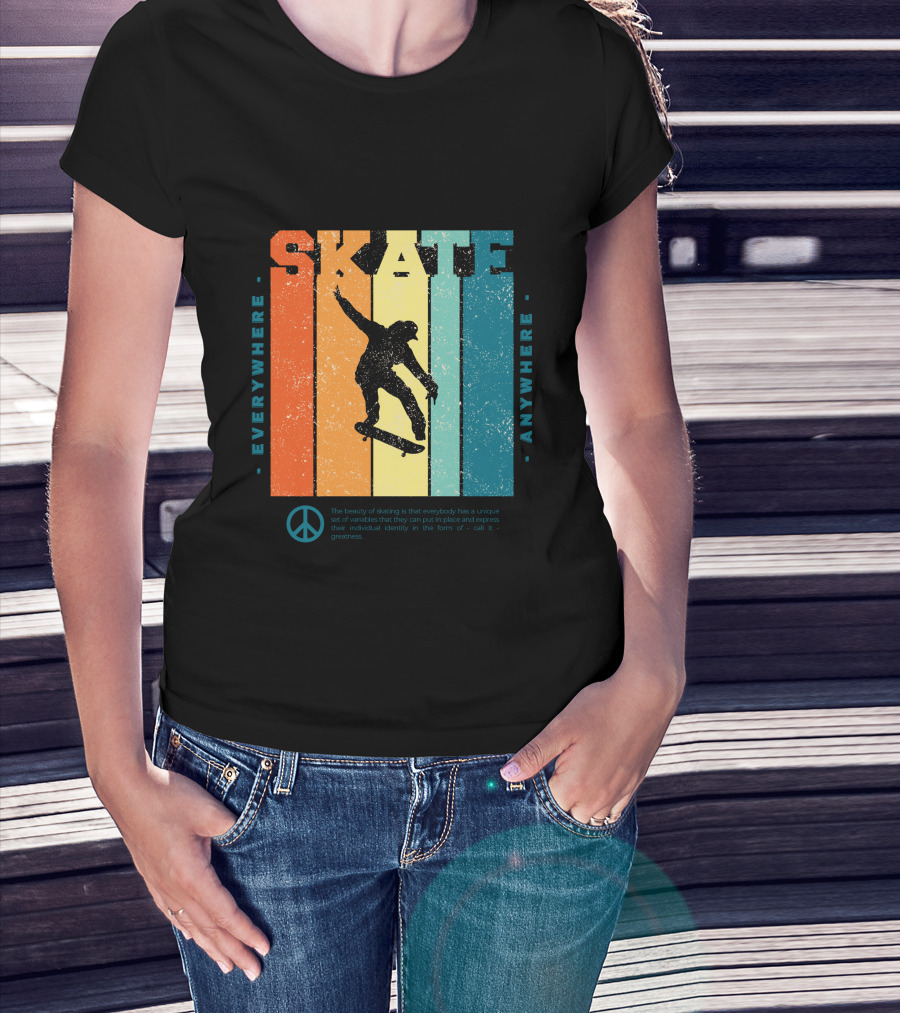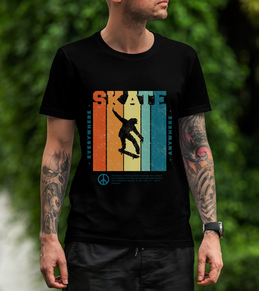 The SKATE Everywhere Anywhere Peace T-shirt is designed for everyday wear and a consistent fit. Fabric is pre-shrunk ring-spun cotton with durable stitching. See the size chart below for exact measurements.
