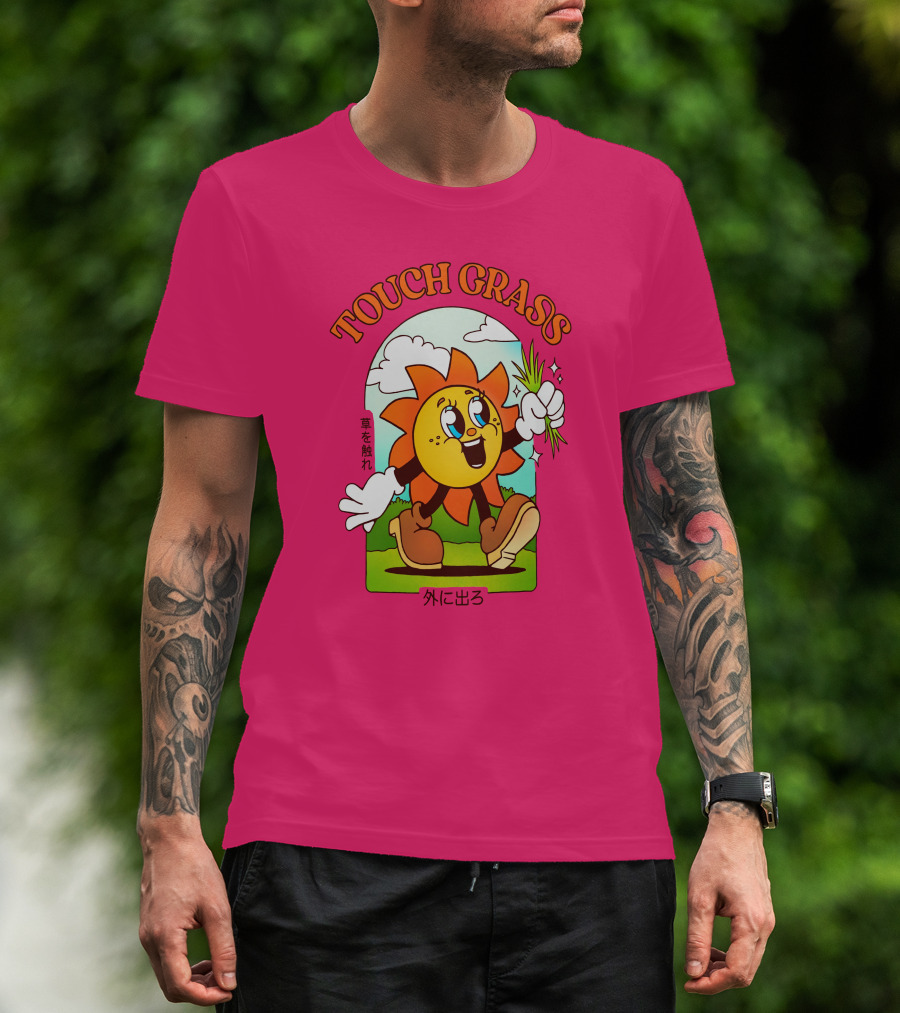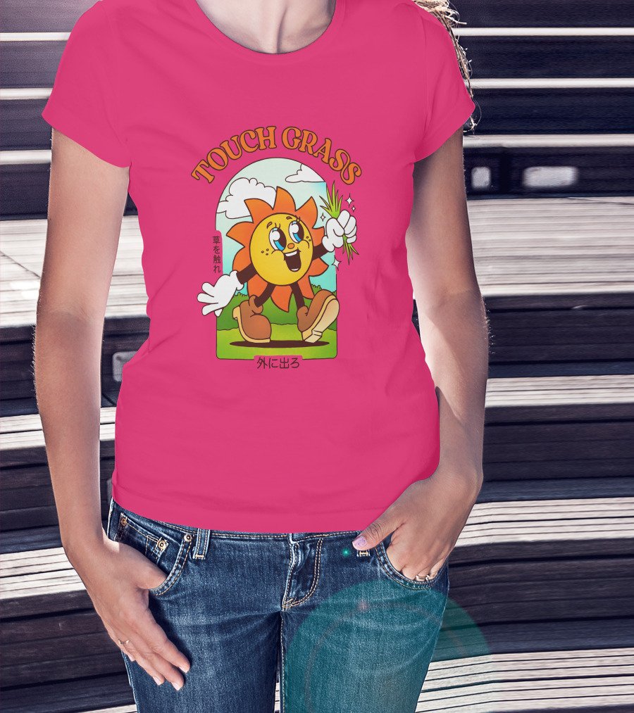 The TOUCH GRASS Hellvetika Sunflower Character Boots Japan Text T-shirt is designed for everyday wear and a consistent fit. Fabric is pre-shrunk ring-spun cotton with durable stitching. See the size chart below for exact measurements.