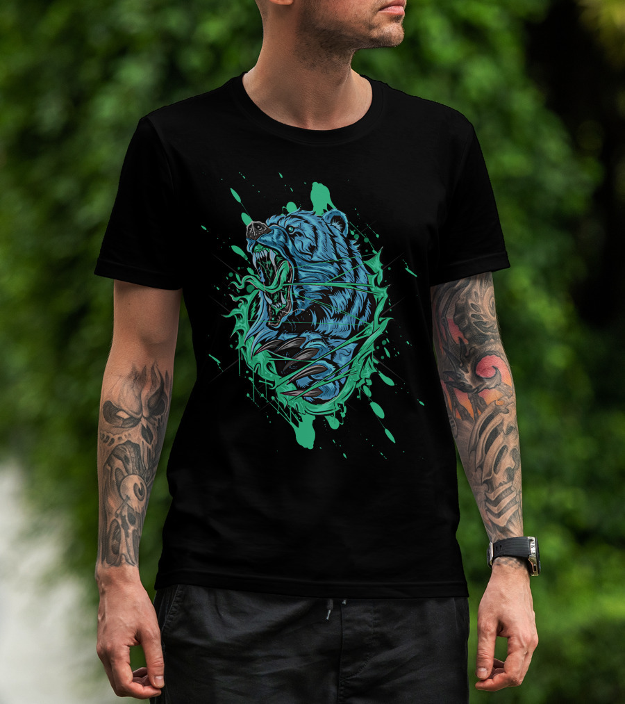 Angry Bear Roaring In Dynamic Teal And Black Paint Splash T-Shirt
