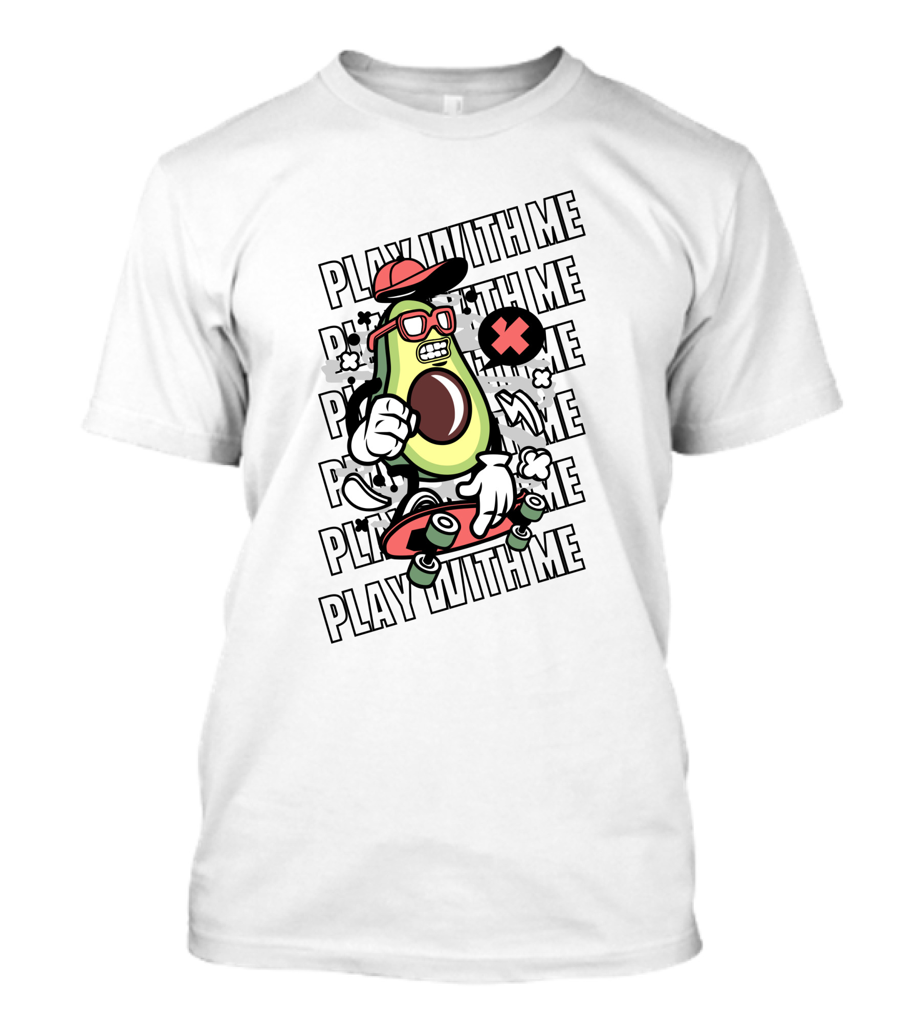 The Play With Me Skateboarding Avocado with Cap and Glasses T-shirt is designed for everyday wear and a consistent fit. Fabric is pre-shrunk ring-spun cotton with durable stitching. See the size chart below for exact measurements.