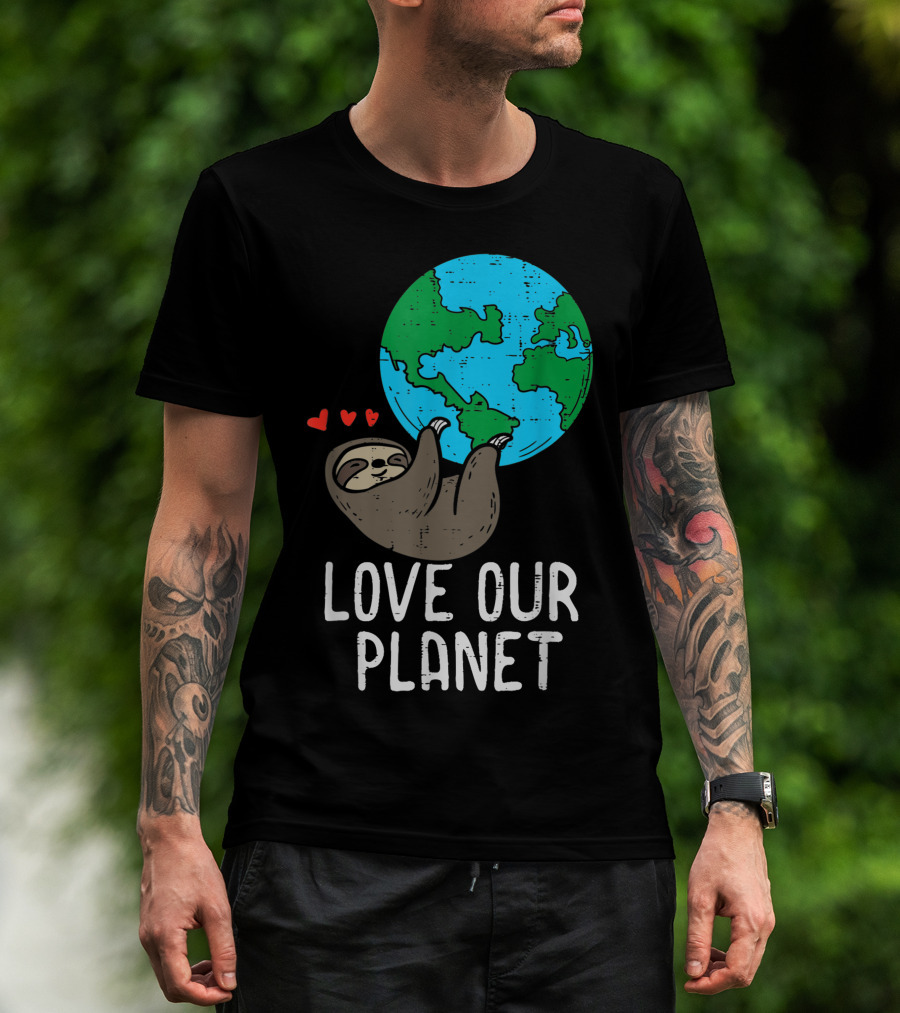 Love Our Planet Sloth Hanging Earth Day Cute Men Hearts Earth T-Shirt