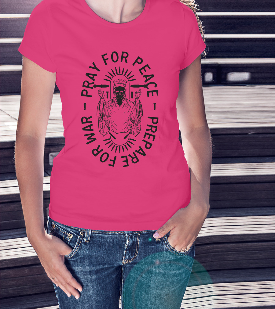 The Lord Bell Pray for Peace Prepare for War Skeleton Halo T-shirt is designed for everyday wear and a consistent fit. Fabric is pre-shrunk ring-spun cotton with durable stitching. See the size chart below for exact measurements.