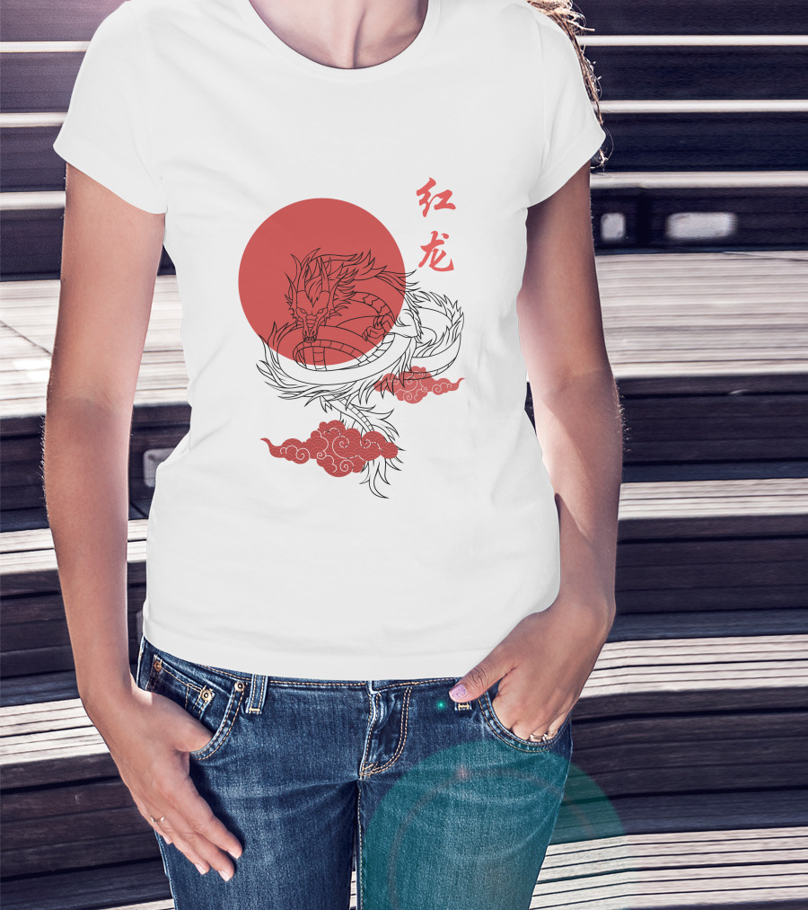 Red Dragon Asian Symbol With Sun And Clouds T-Shirt