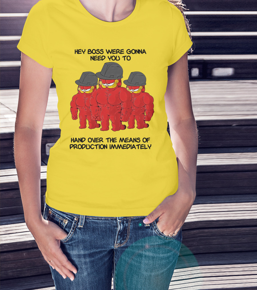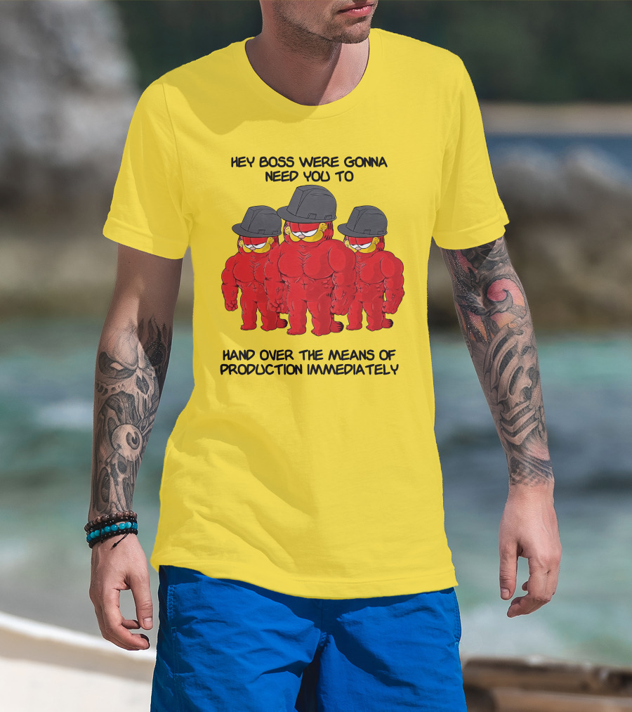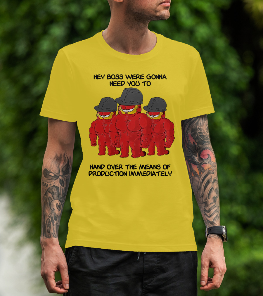 The Hey Boss Were Gonna Need You To Hand Over The Means Of Production Immediately Buff Cartoon Character Trio Initiative T-shirt is designed for everyday wear and a consistent fit. Fabric is pre-shrunk ring-spun cotton with durable stitching. See the size chart below for exact measurements.