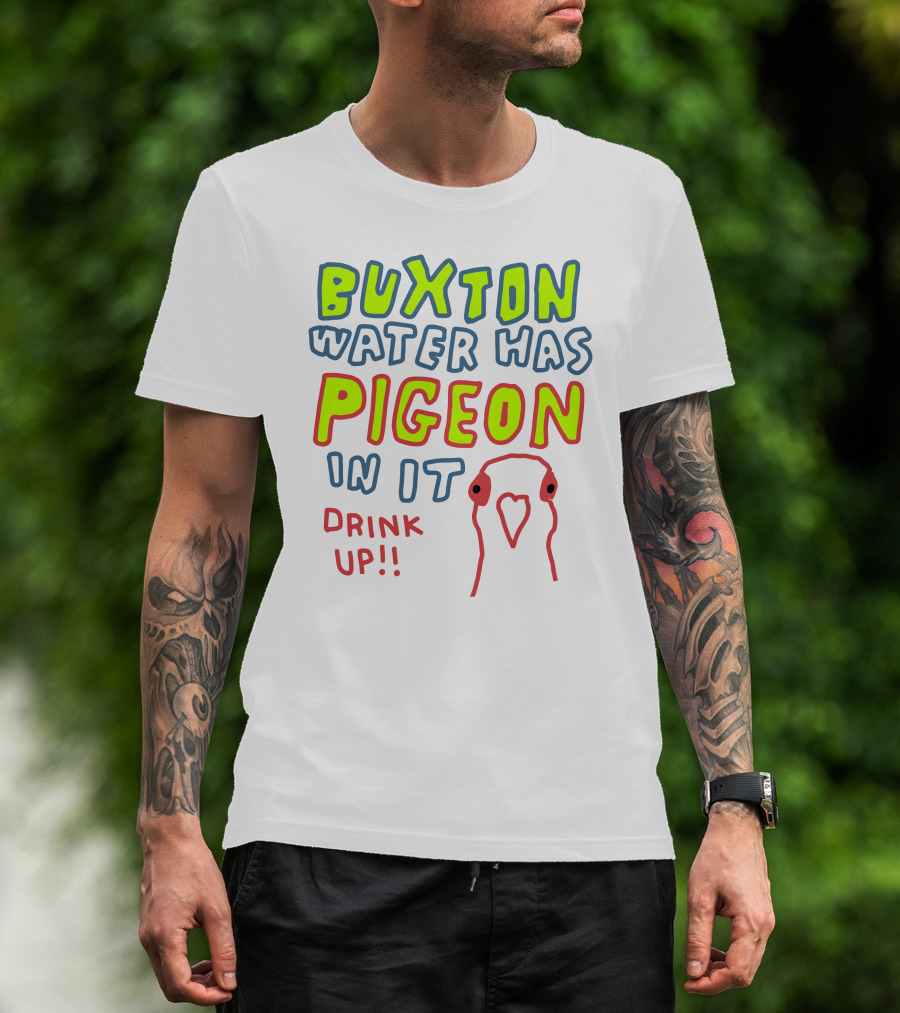 Buxton Water Has Pigeon In It Drink Up With Colorful Text And Pigeon Outline T-Shirt