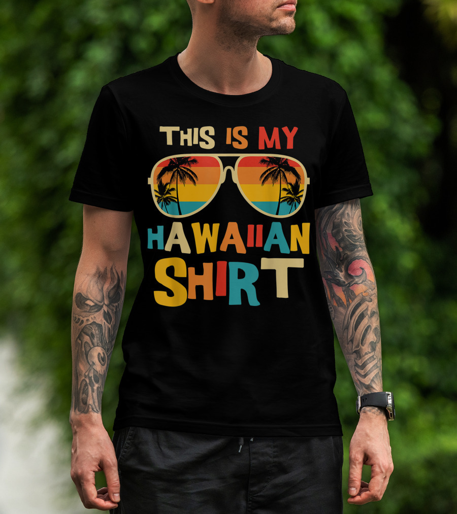 The This Is My Hawaiian Shirt Tropical Sunset Sunglasses Palm Trees T-shirt is designed for everyday wear and a consistent fit. Fabric is pre-shrunk ring-spun cotton with durable stitching. See the size chart below for exact measurements.