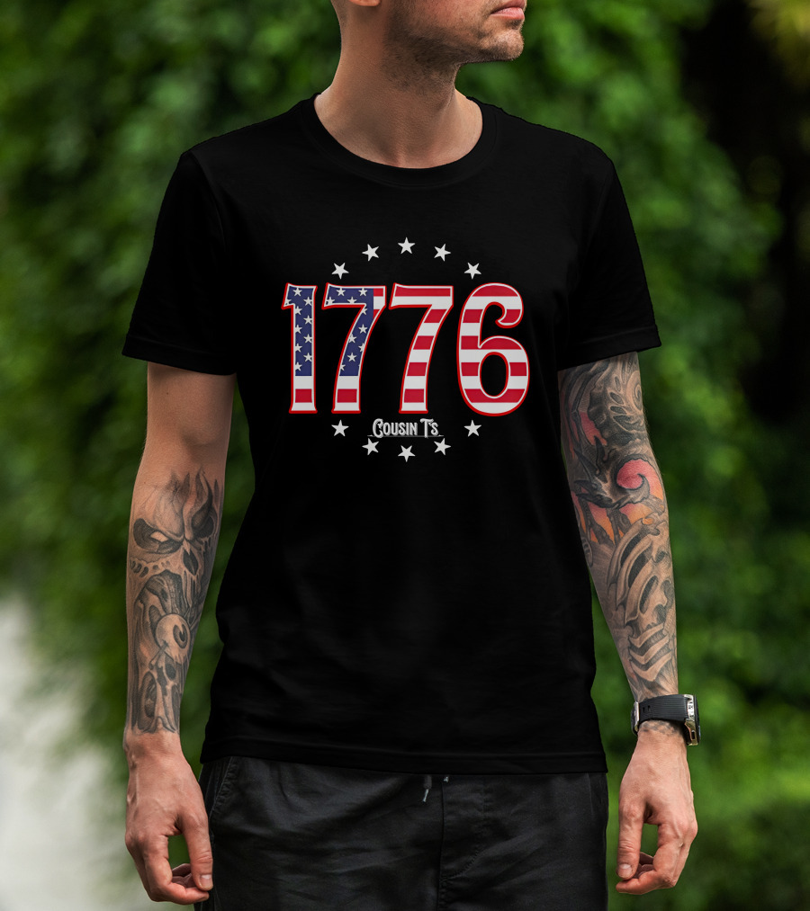 The 1776 Cousin T's Men's Patriotic T-shirt is designed for everyday wear and a consistent fit. Fabric is pre-shrunk ring-spun cotton with durable stitching. See the size chart below for exact measurements.