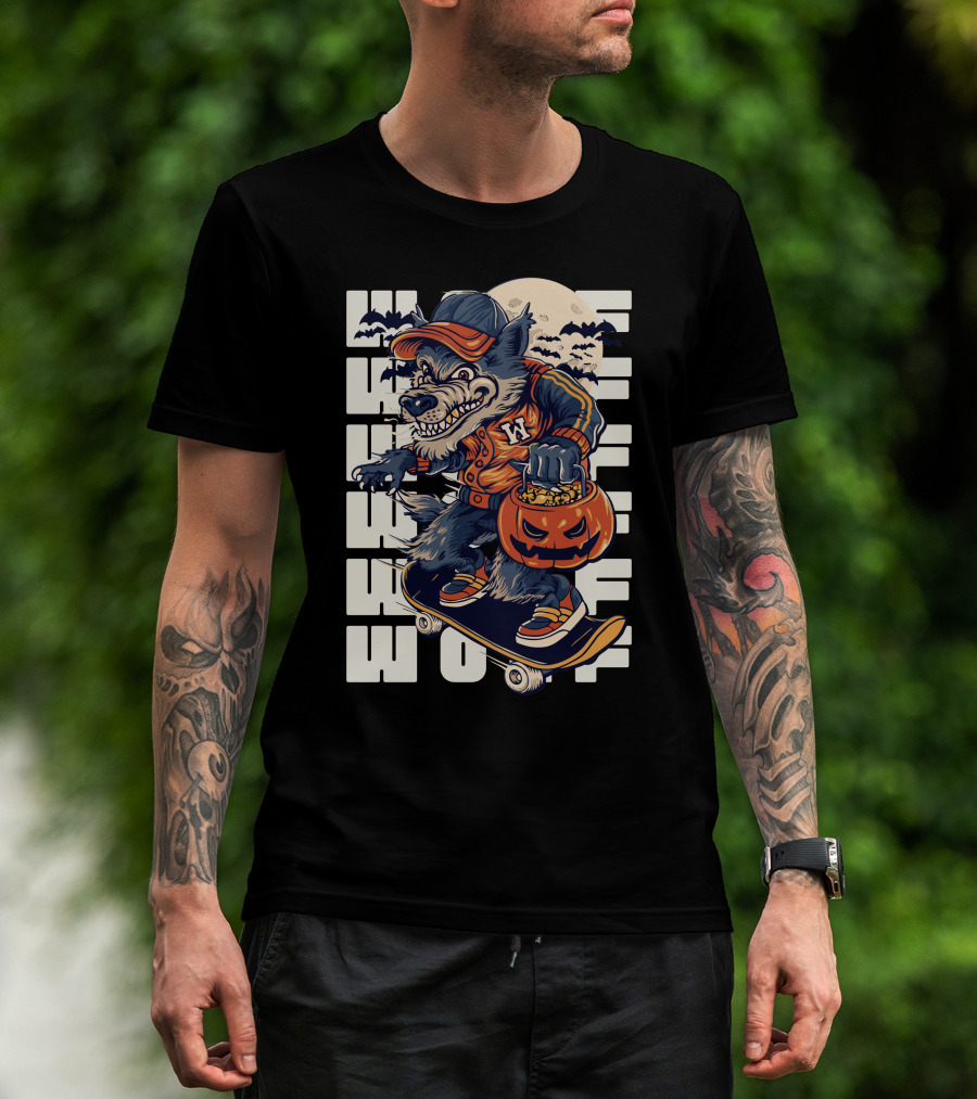 Wolf Trick-or-Treat Skateboarder With Pumpkin And Moon T-Shirt