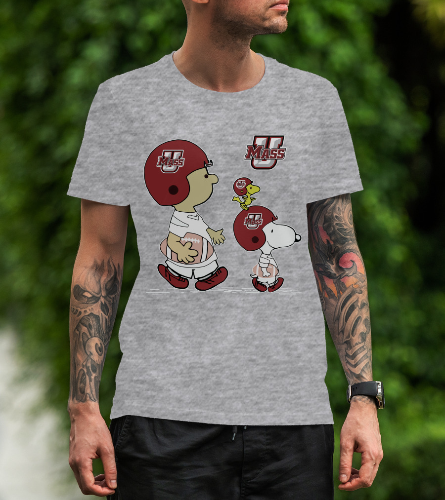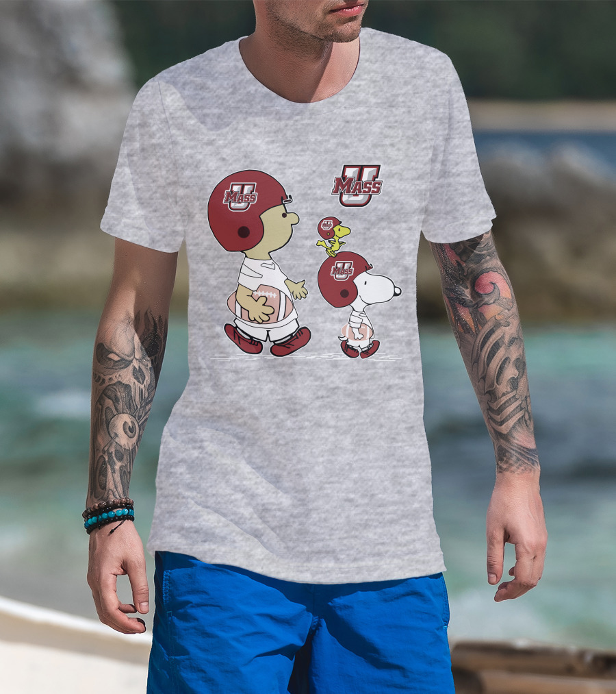 U Mass School Spirit Snoopy Football Helmet Charlie Woodstock T-Shirt