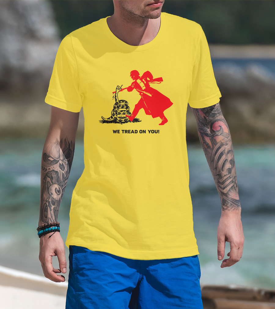 We Tread On You Revolutionary Soldier And Snake Yellow Background T-Shirt