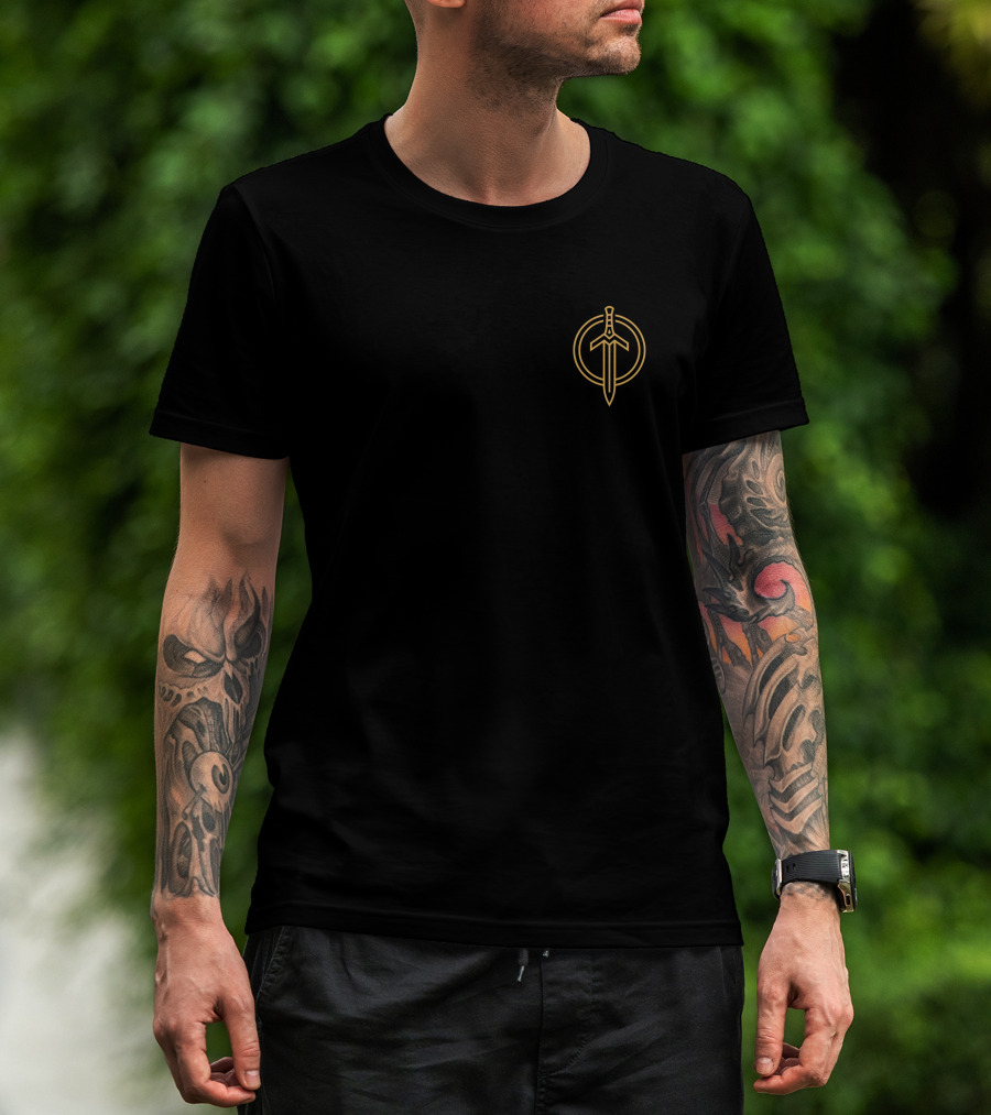 The Golden Guardians Basics Sword Emblem T-shirt is designed for everyday wear and a consistent fit. Fabric is pre-shrunk ring-spun cotton with durable stitching. See the size chart below for exact measurements.