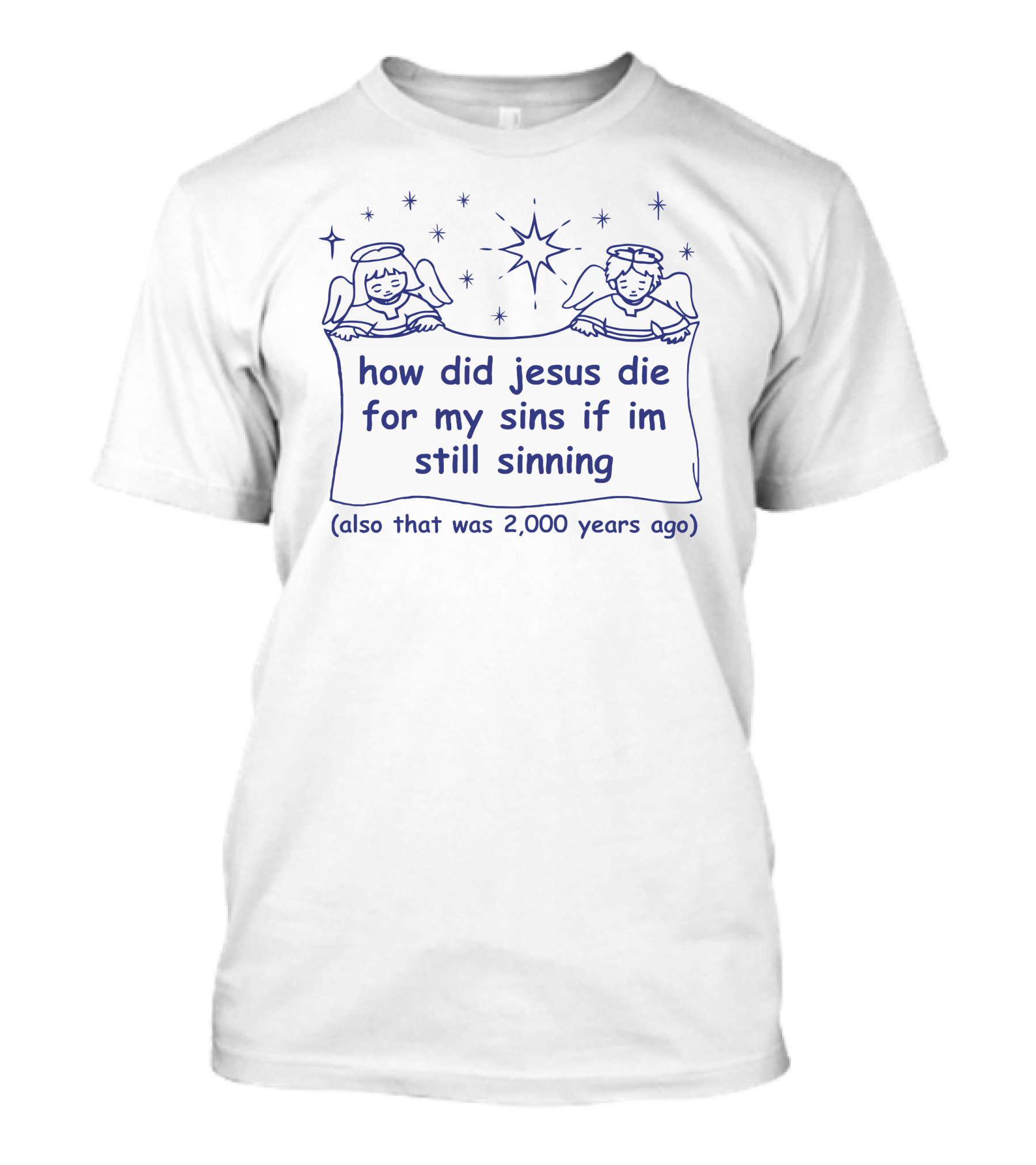 The How Did Jesus Die for My Sins If I'm Still Sinning Also That Was 2,000 Years Ago T-shirt is designed for everyday wear and a consistent fit. Fabric is pre-shrunk ring-spun cotton with durable stitching. See the size chart below for exact measurements.