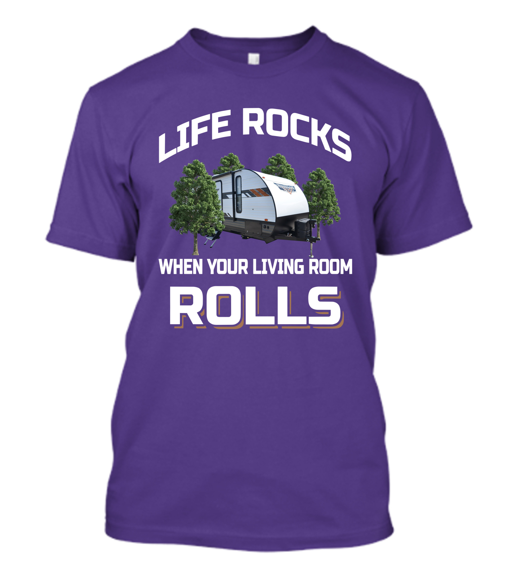 The LIFE ROCKS WHEN YOUR LIVING ROOM ROLLS Wildwood Camper Trees T-shirt is designed for everyday wear and a consistent fit. Fabric is pre-shrunk ring-spun cotton with durable stitching. See the size chart below for exact measurements.
