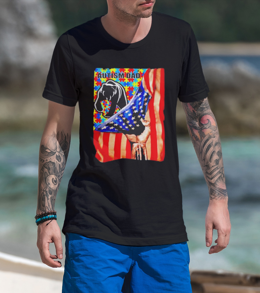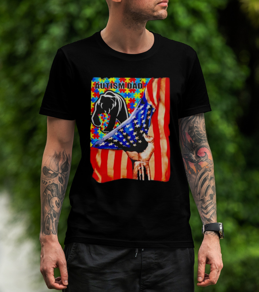 Autism Dad Bear USA Flag Puzzle Awareness T-Shirt