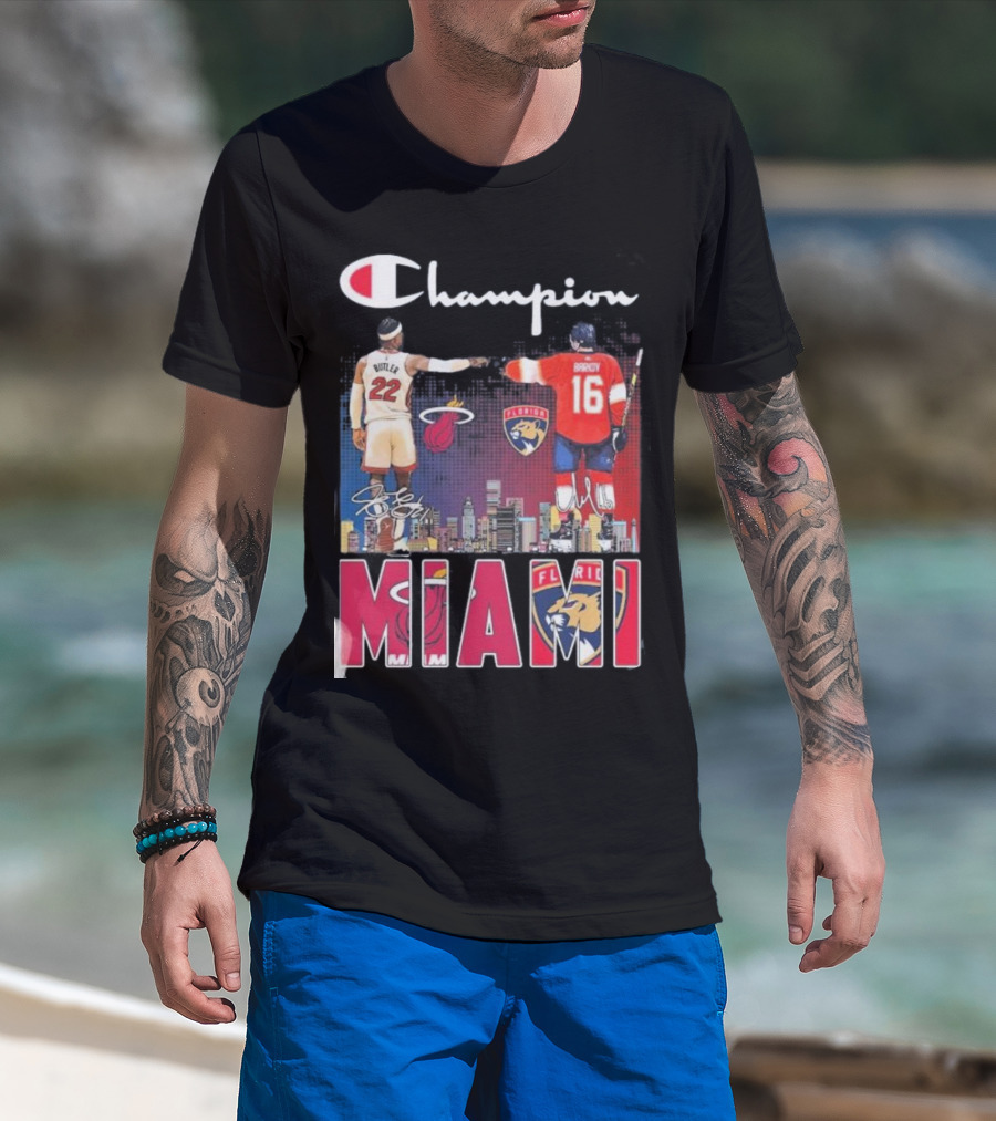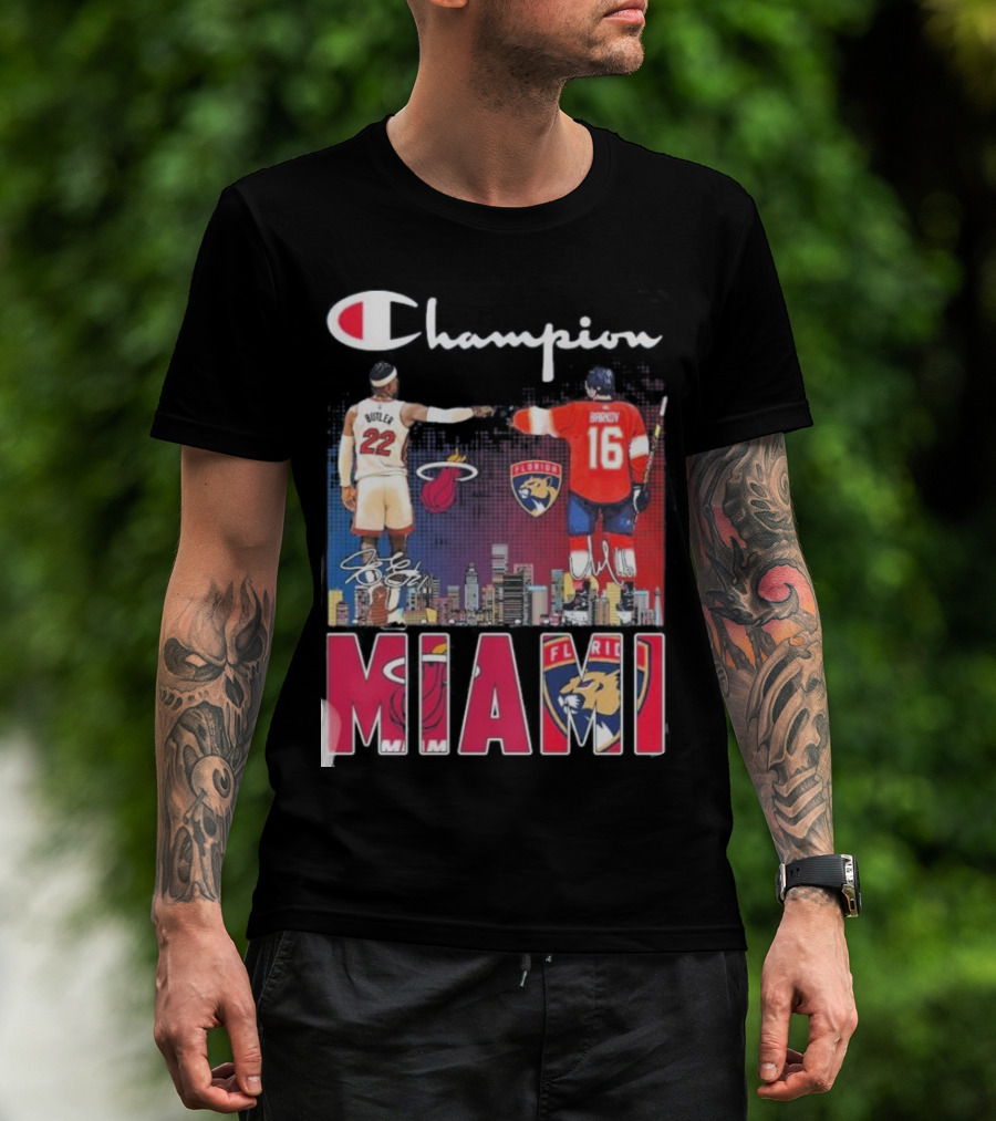 Champion Miami Skyline Signatures 22 Jimmy Butler 16 Aleksander Barkov Sports T-Shirt