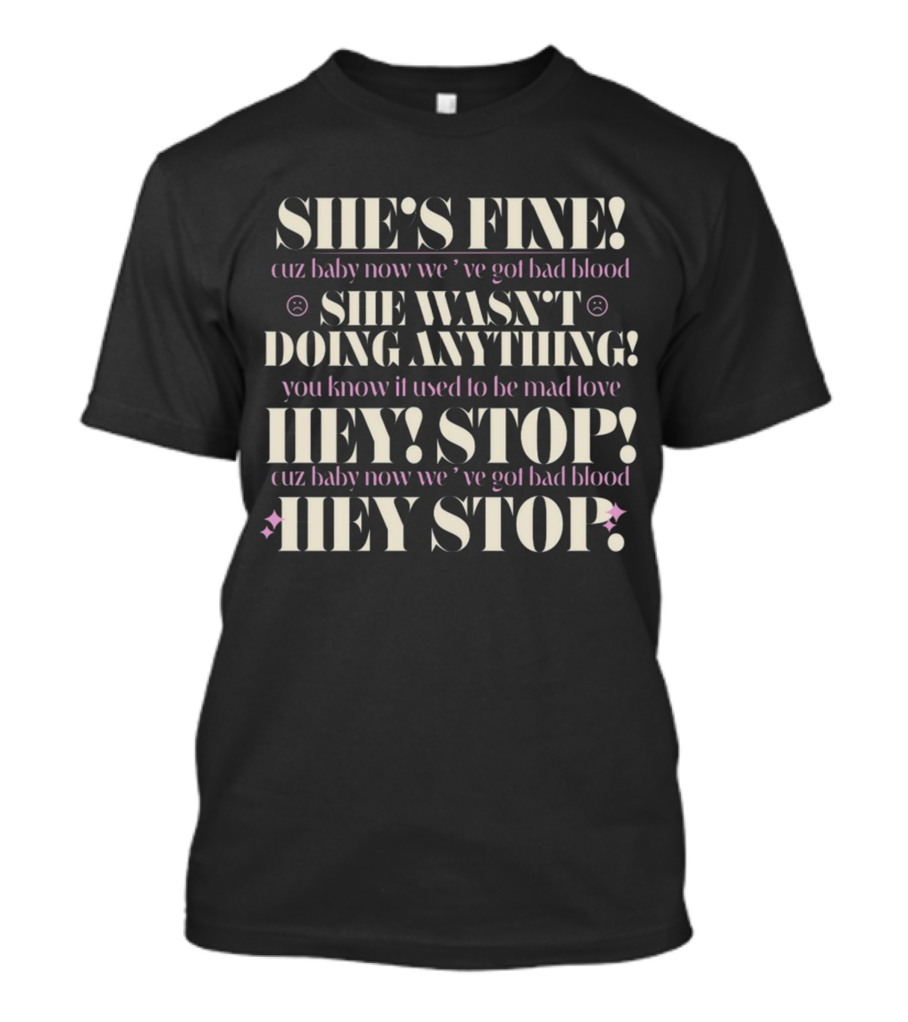 The SHE'S FINE Cuz Baby Now We've Got Bad Blood She Wasn't Doing Anything Hey Stop You Know It Used to Be Mad Love T-shirt is designed for everyday wear and a consistent fit. Fabric is pre-shrunk ring-spun cotton with durable stitching. See the size chart below for exact measurements.