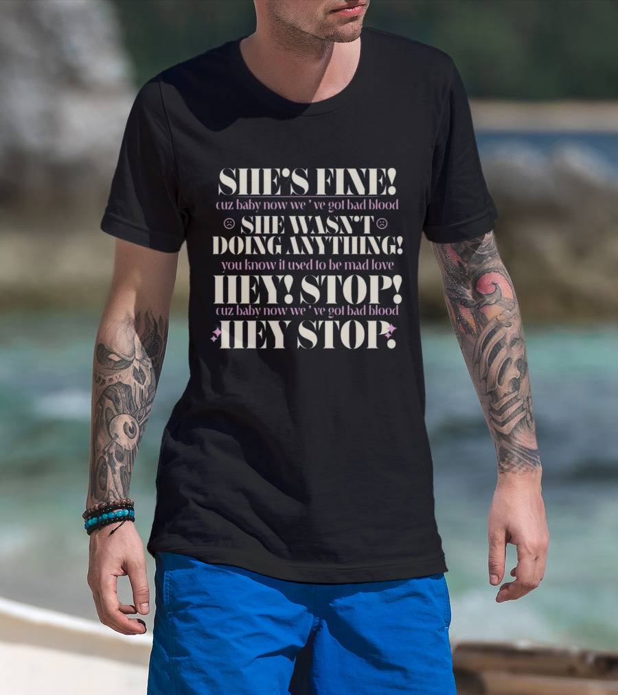 SHE'S FINE Cuz Baby Now We've Got Bad Blood She Wasn't Doing Anything Hey Stop You Know It Used To Be Mad Love T-Shirt