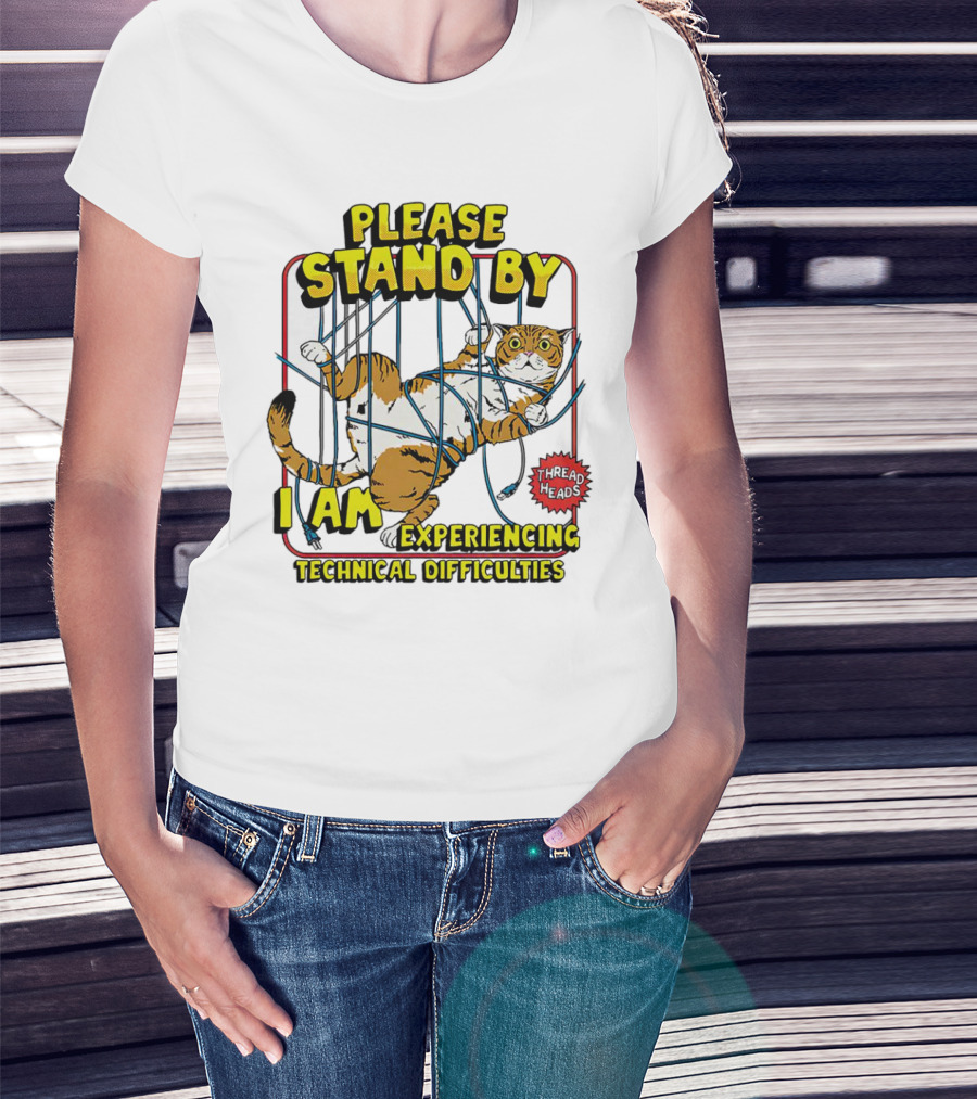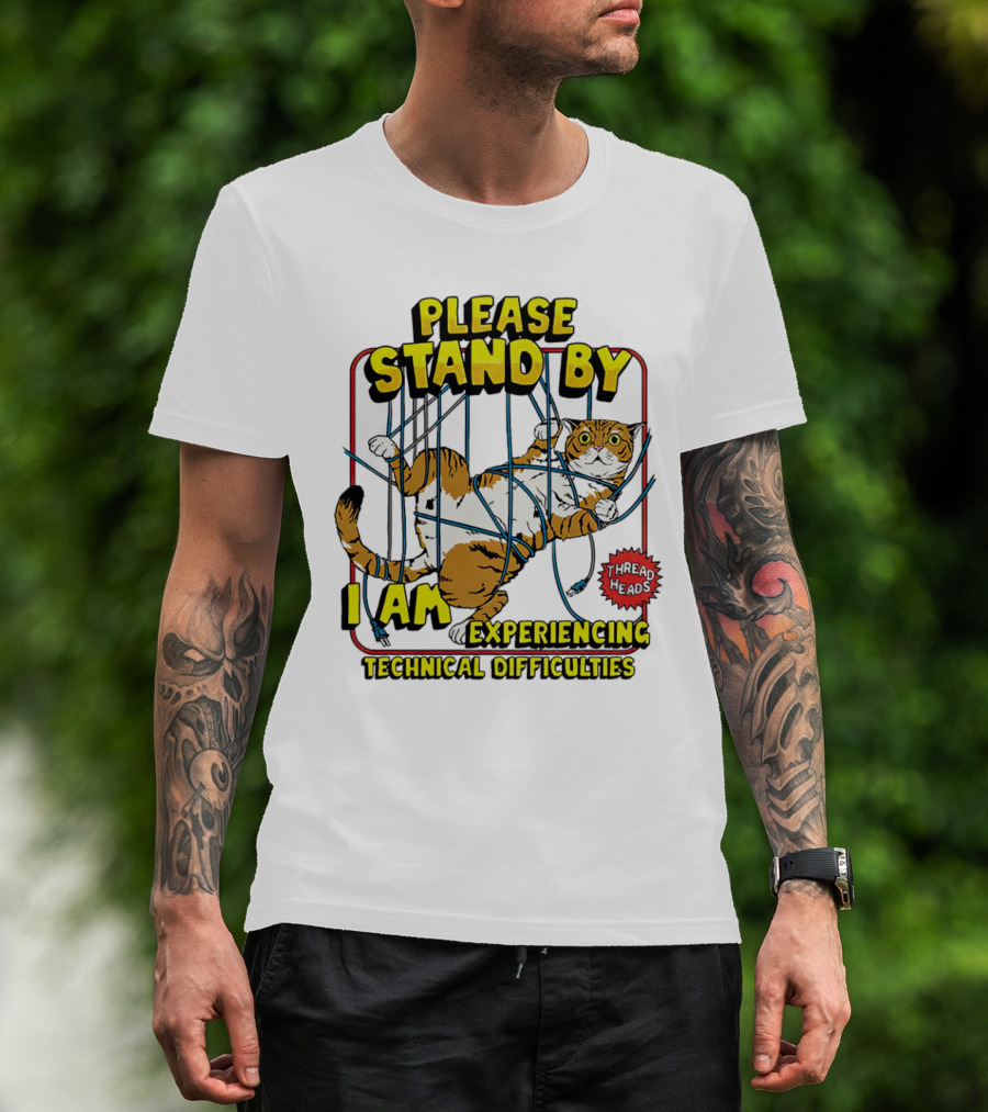 Please Stand By I Am Experiencing Technical Difficulties Cat Tangled In Blue Cords T-Shirt