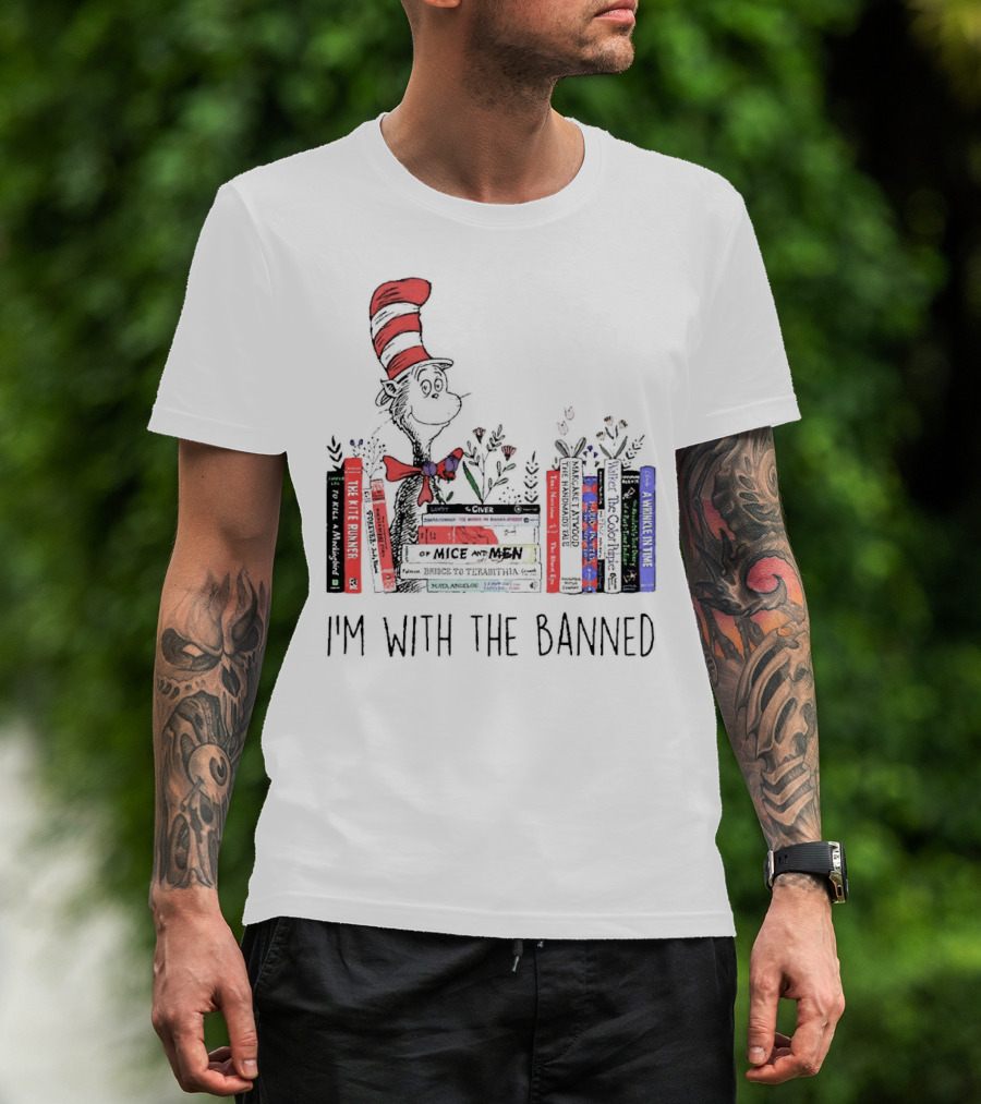 Dr Seuss I'm With The Banned Cat In The Hat Of Mice And Men To Kill A Mockingbird The Color Purple The Handmaid's Tale 1984 T-Shirt