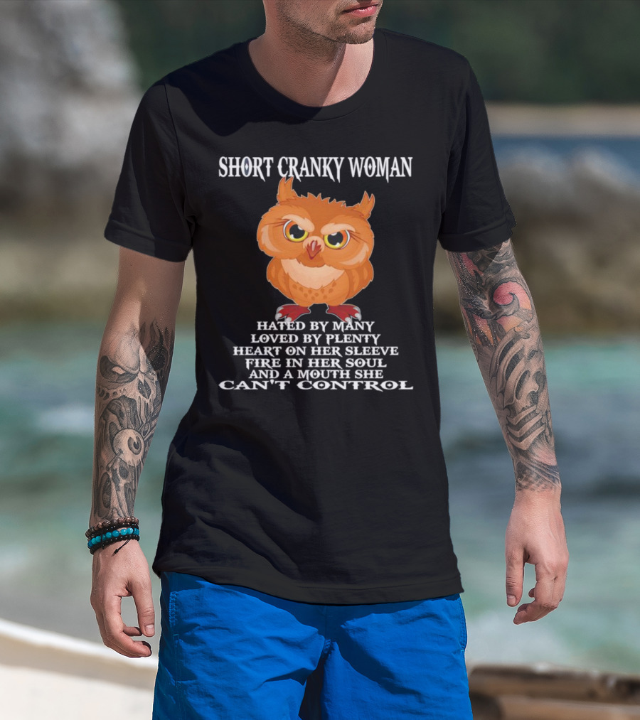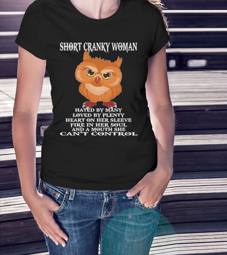 The Short Cranky Woman Owl Hated by Many Loved by Plenty Heart on Her Sleeve Fire in Her Soul Can't Control T-shirt is designed for everyday wear and a consistent fit. Fabric is pre-shrunk ring-spun cotton with durable stitching. See the size chart below for exact measurements.