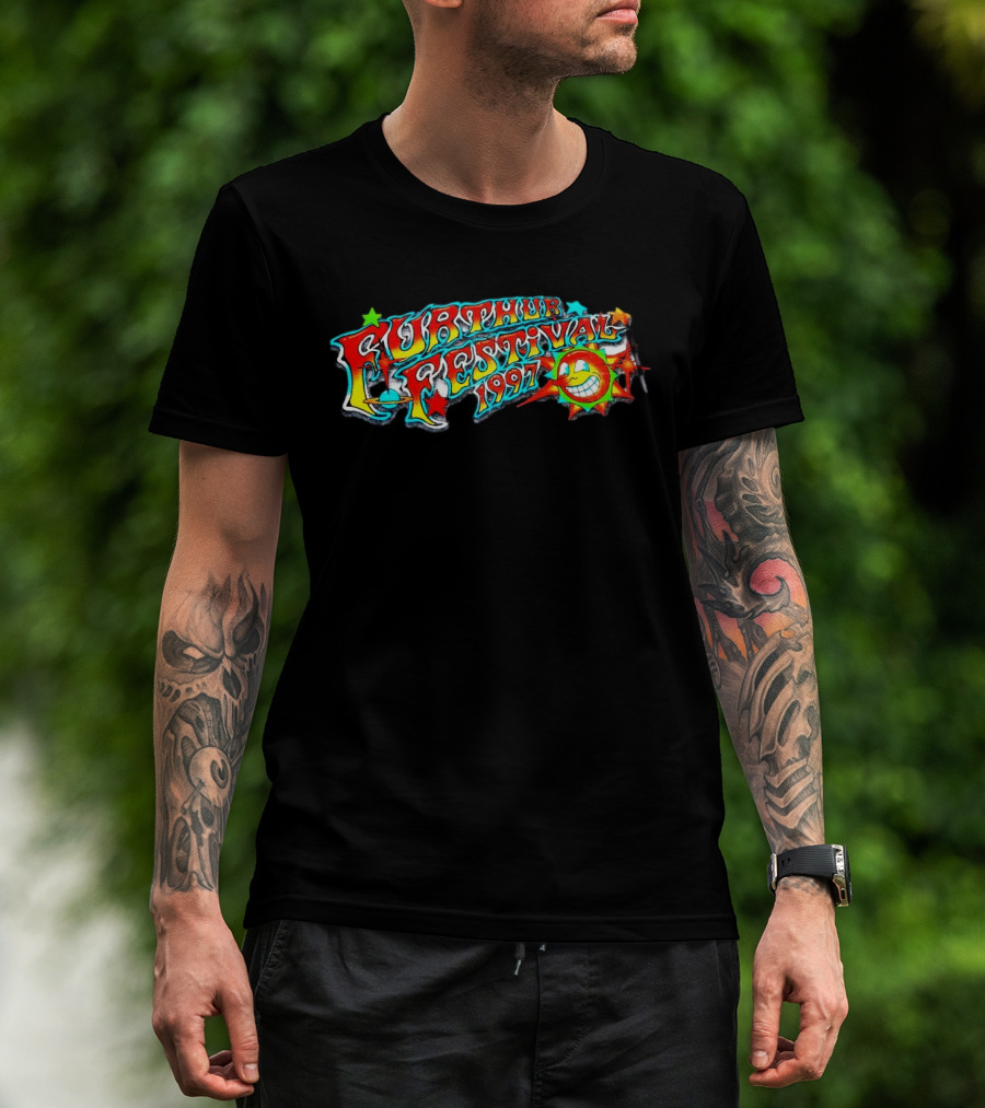 The Furthur Festival 1997 Smiling Sun and Stars Psychedelic Text T-shirt is designed for everyday wear and a consistent fit. Fabric is pre-shrunk ring-spun cotton with durable stitching. See the size chart below for exact measurements.
