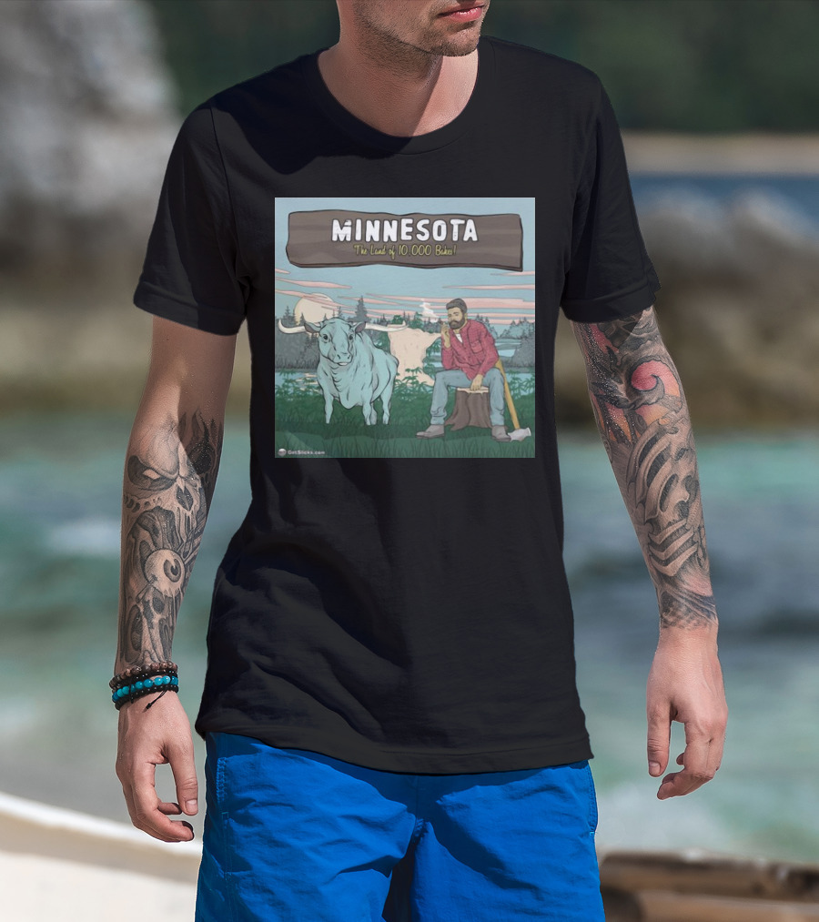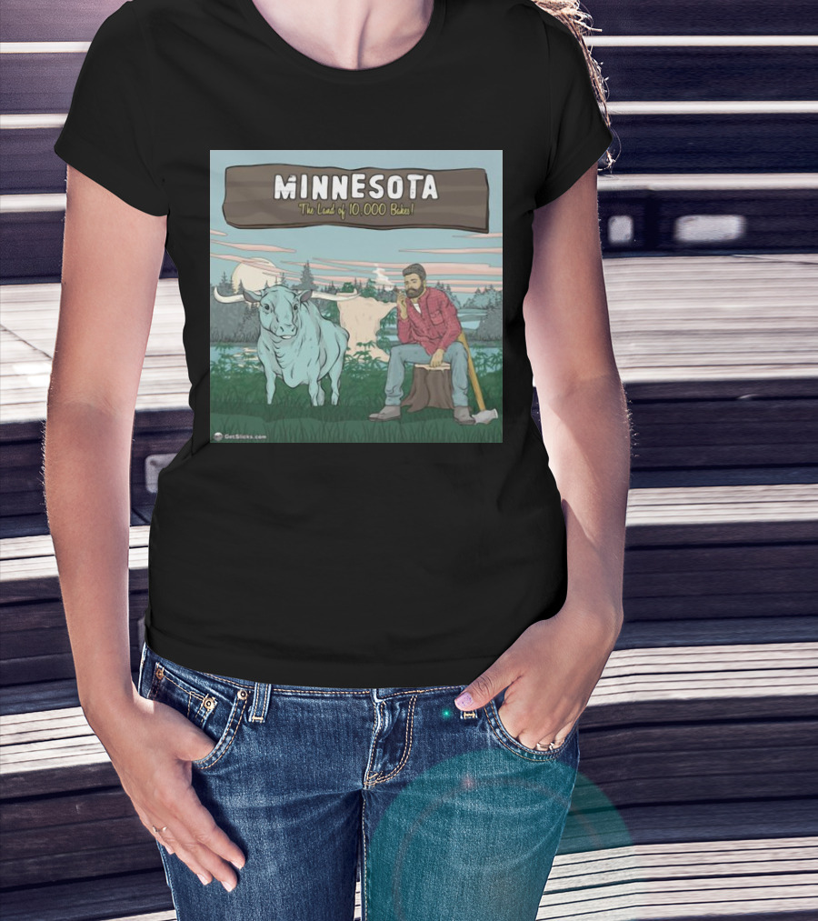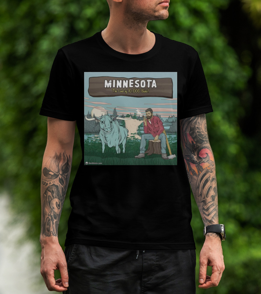 Minnesota The Land Of 10,000 Bakes With Blue Ox And Lumberjack In Forest Scene T-Shirt