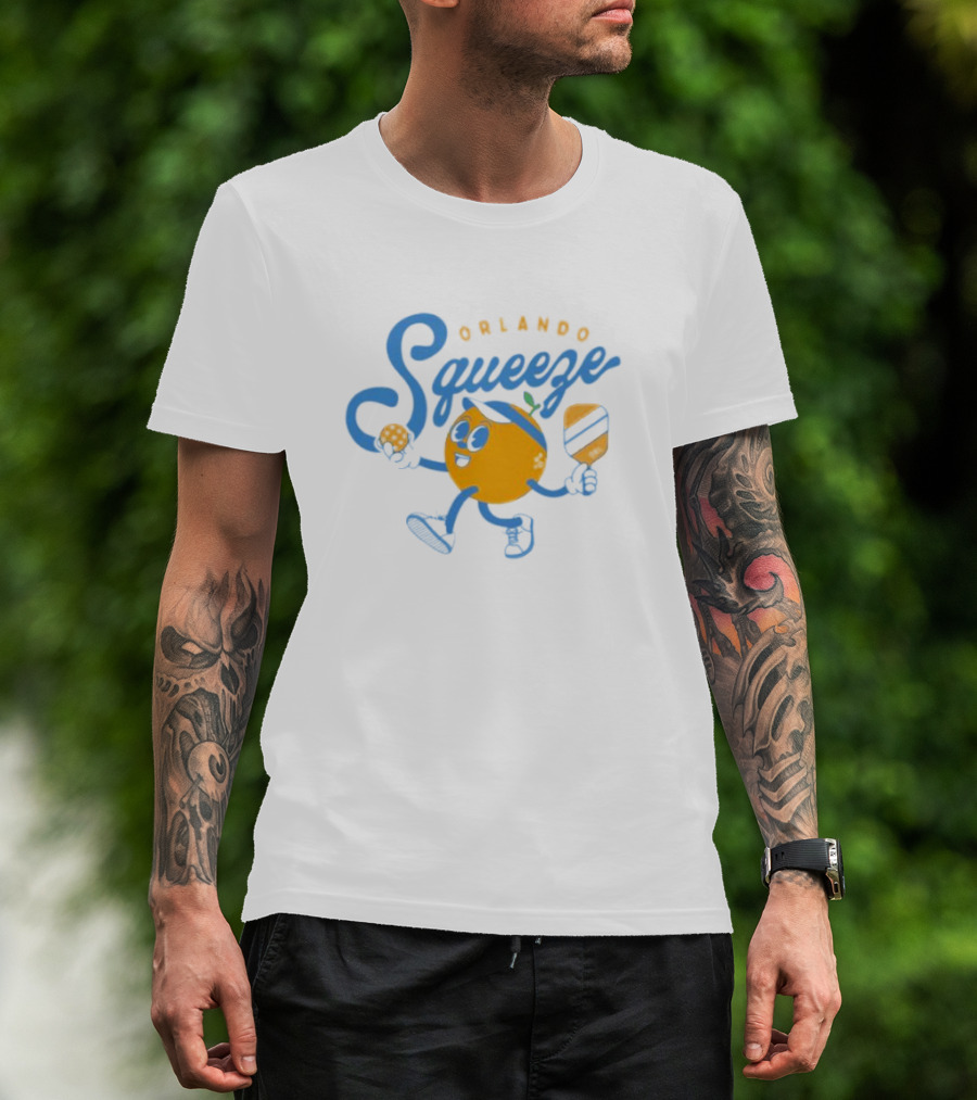 The Orlando Squeeze Happy Orange Character with Paddle and Ball T-shirt is designed for everyday wear and a consistent fit. Fabric is pre-shrunk ring-spun cotton with durable stitching. See the size chart below for exact measurements.