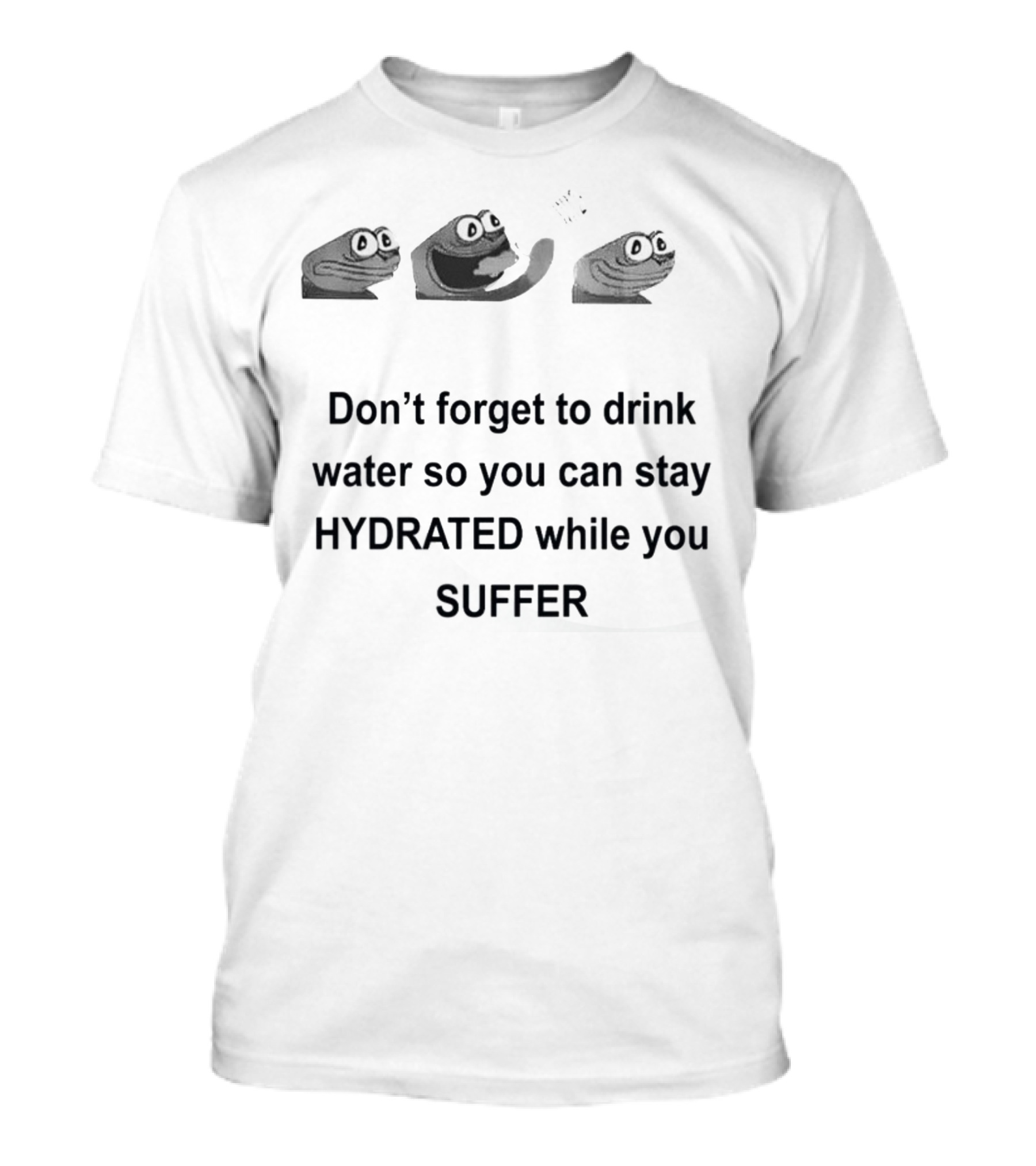 The Don't Forget to Drink Water So You Can Stay Hydrated While You Suffer Meme Frog Hydration Reminder T-shirt is designed for everyday wear and a consistent fit. Fabric is pre-shrunk ring-spun cotton with durable stitching. See the size chart below for exact measurements.