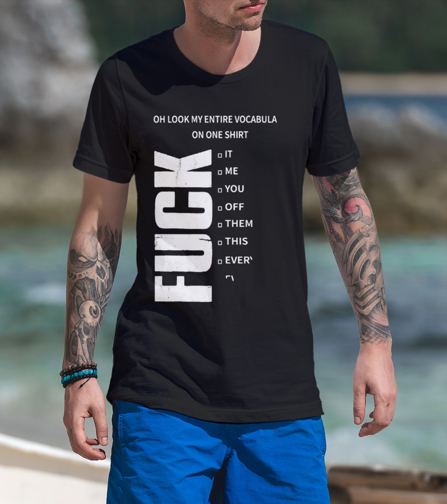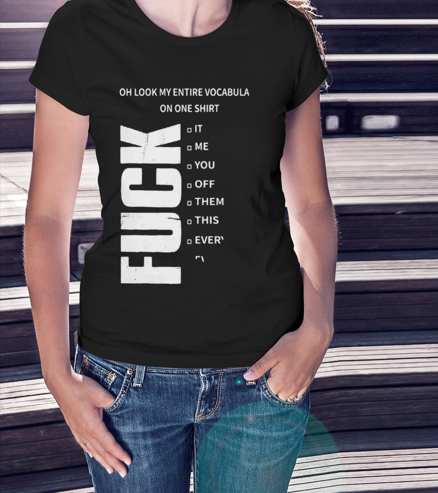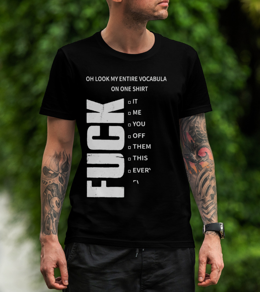 The Oh Look My Entire Vocabulary on One Shirt F--- It Me You Off Them This Everything T-shirt is designed for everyday wear and a consistent fit. Fabric is pre-shrunk ring-spun cotton with durable stitching. See the size chart below for exact measurements.