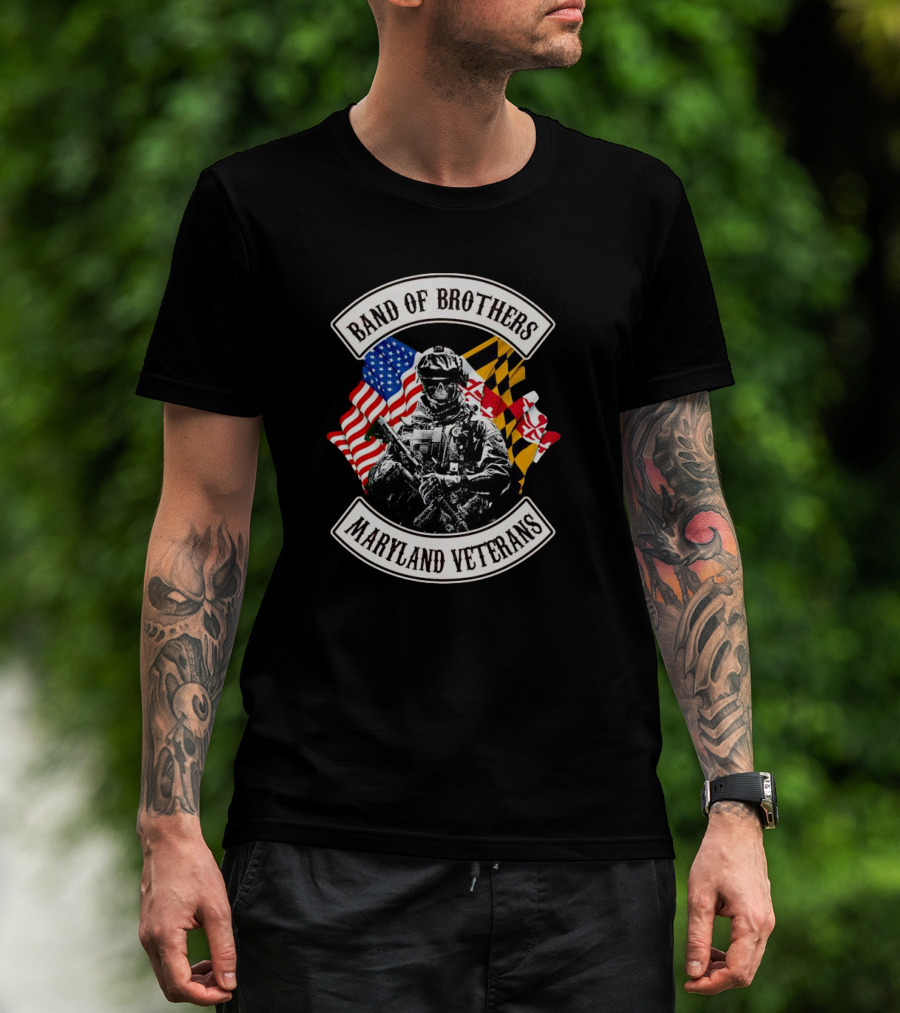 Band Of Brothers Maryland Veterans Soldier With American And Maryland Flags T-Shirt