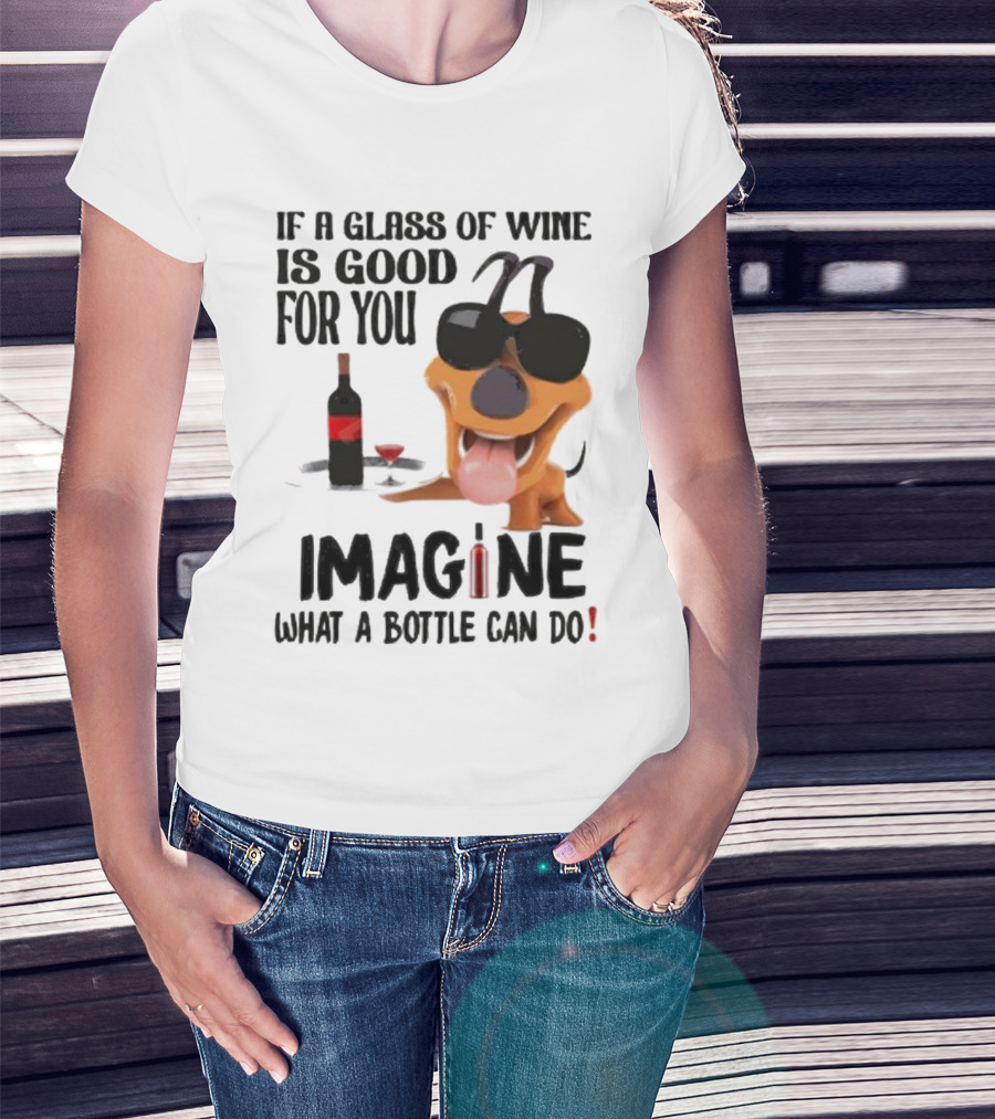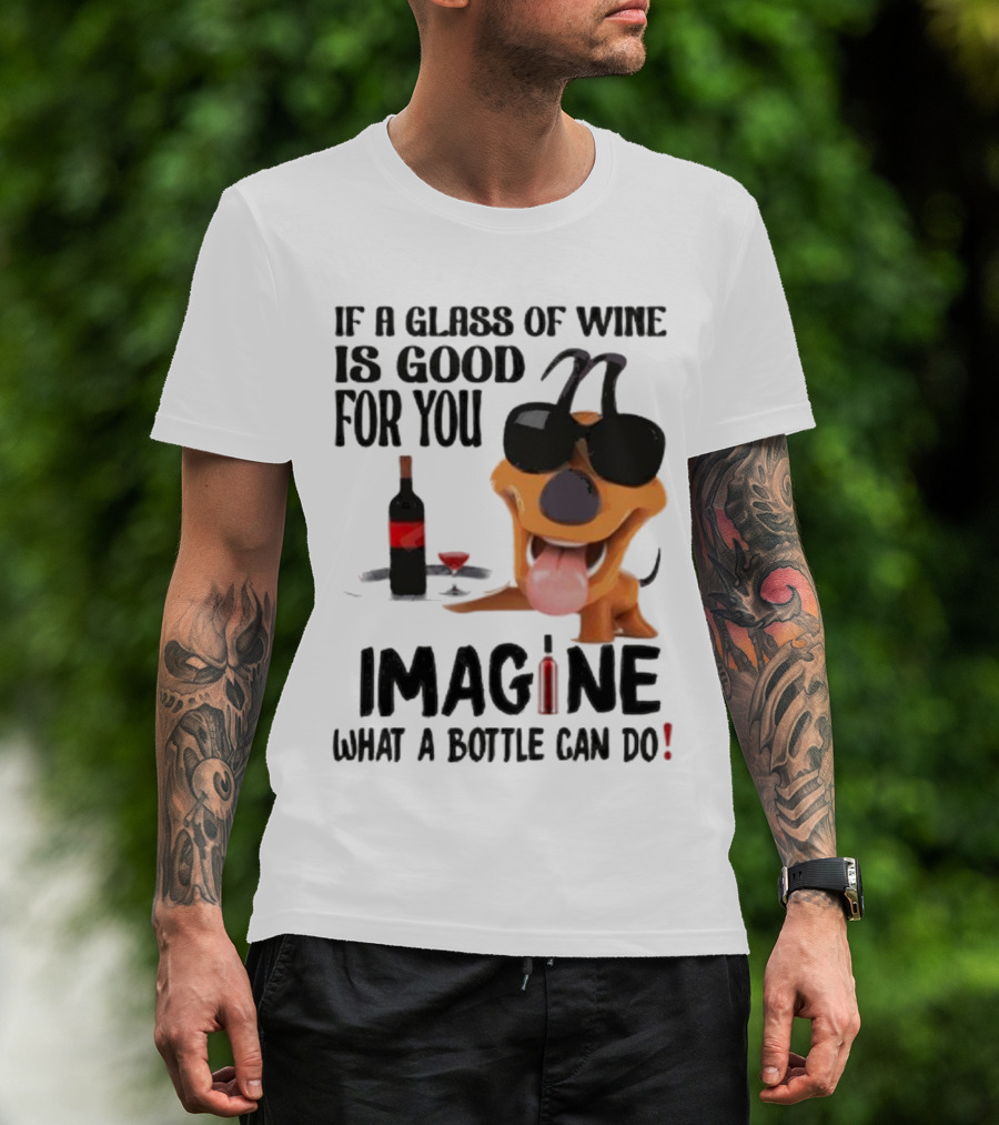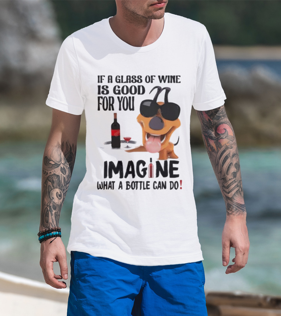 The Dog with Wine Bottle and Glass If a Glass of Wine is Good for You Imagine What a Bottle Can Do T-shirt is designed for everyday wear and a consistent fit. Fabric is pre-shrunk ring-spun cotton with durable stitching. See the size chart below for exact measurements.