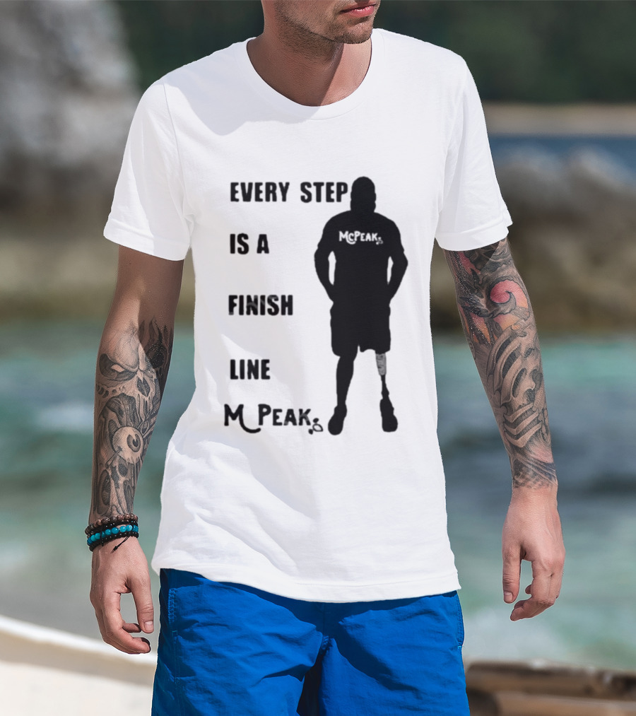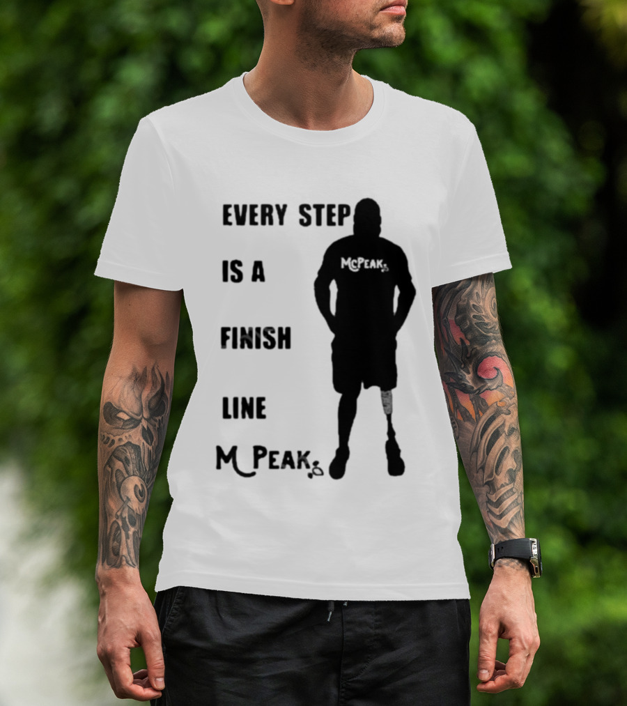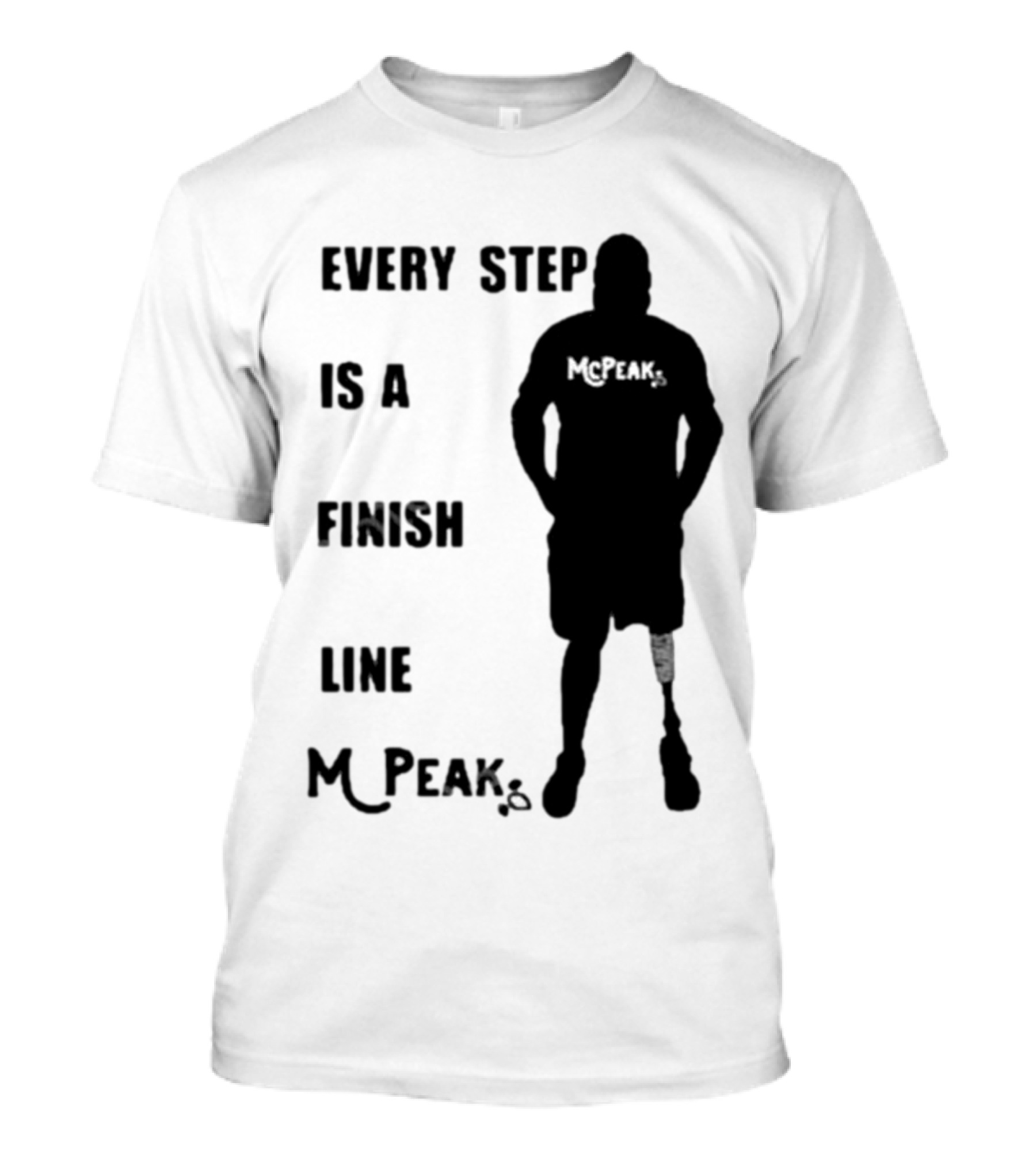 The Every Step Is a Finish Line McPeak T-shirt is designed for everyday wear and a consistent fit. Fabric is pre-shrunk ring-spun cotton with durable stitching. See the size chart below for exact measurements.