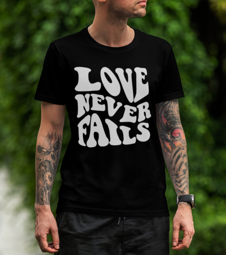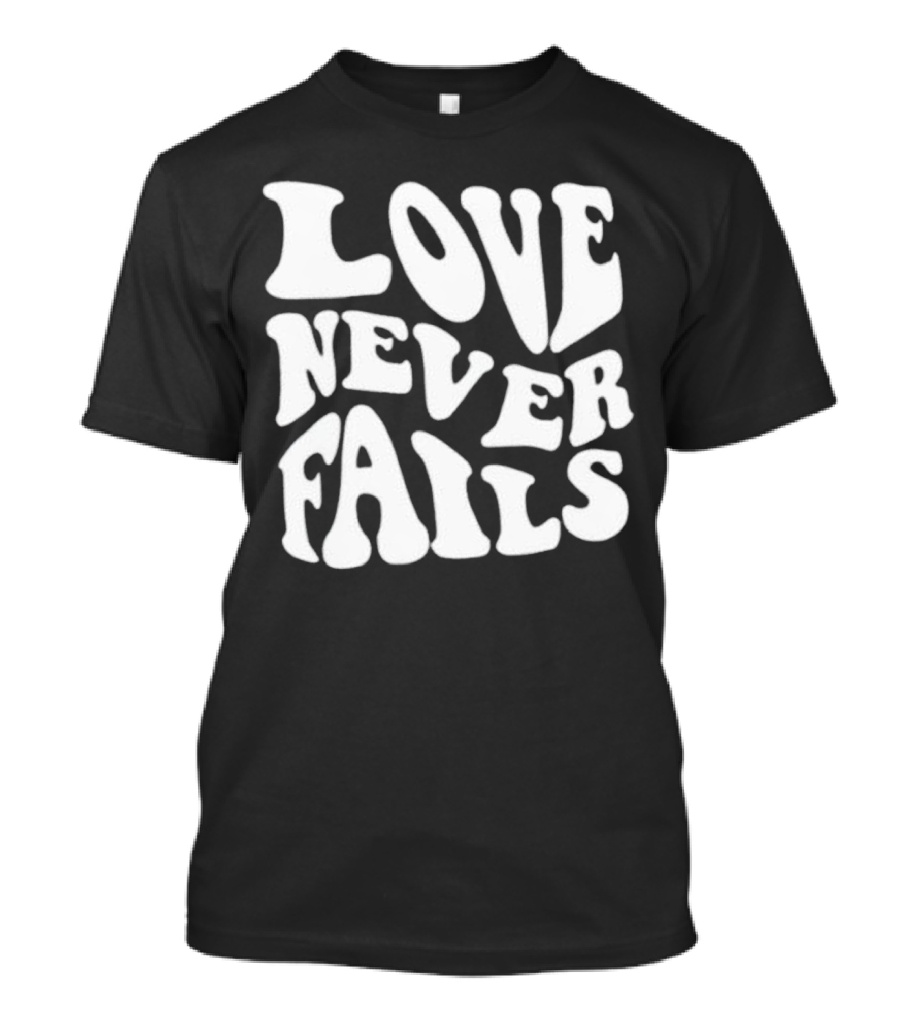 The LOVE NEVER FAILS Vintage Bold Psychedelic Bubble Text T-shirt is designed for everyday wear and a consistent fit. Fabric is pre-shrunk ring-spun cotton with durable stitching. See the size chart below for exact measurements.