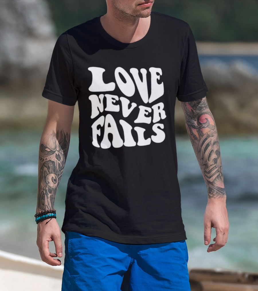 LOVE NEVER FAILS Vintage Bold Psychedelic Bubble Text T-Shirt