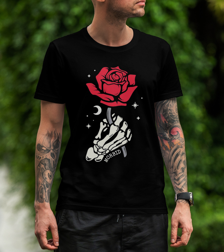 The Morbid Skeleton Rose with Crescent Moon and Stars T-shirt is designed for everyday wear and a consistent fit. Fabric is pre-shrunk ring-spun cotton with durable stitching. See the size chart below for exact measurements.