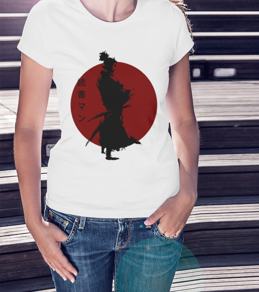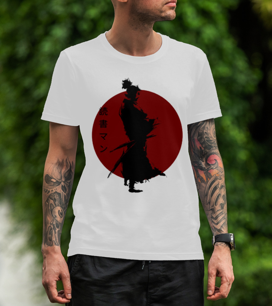 Miyamoto Musashi Samurai Silhouette Red Sun Kanji Reading Man T-Shirt