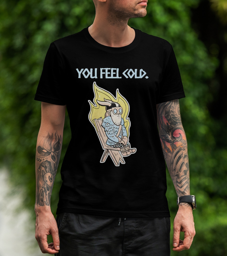Valheim Merch Store You Feel Cold Viking Character Sitting With Flame Background T-Shirt