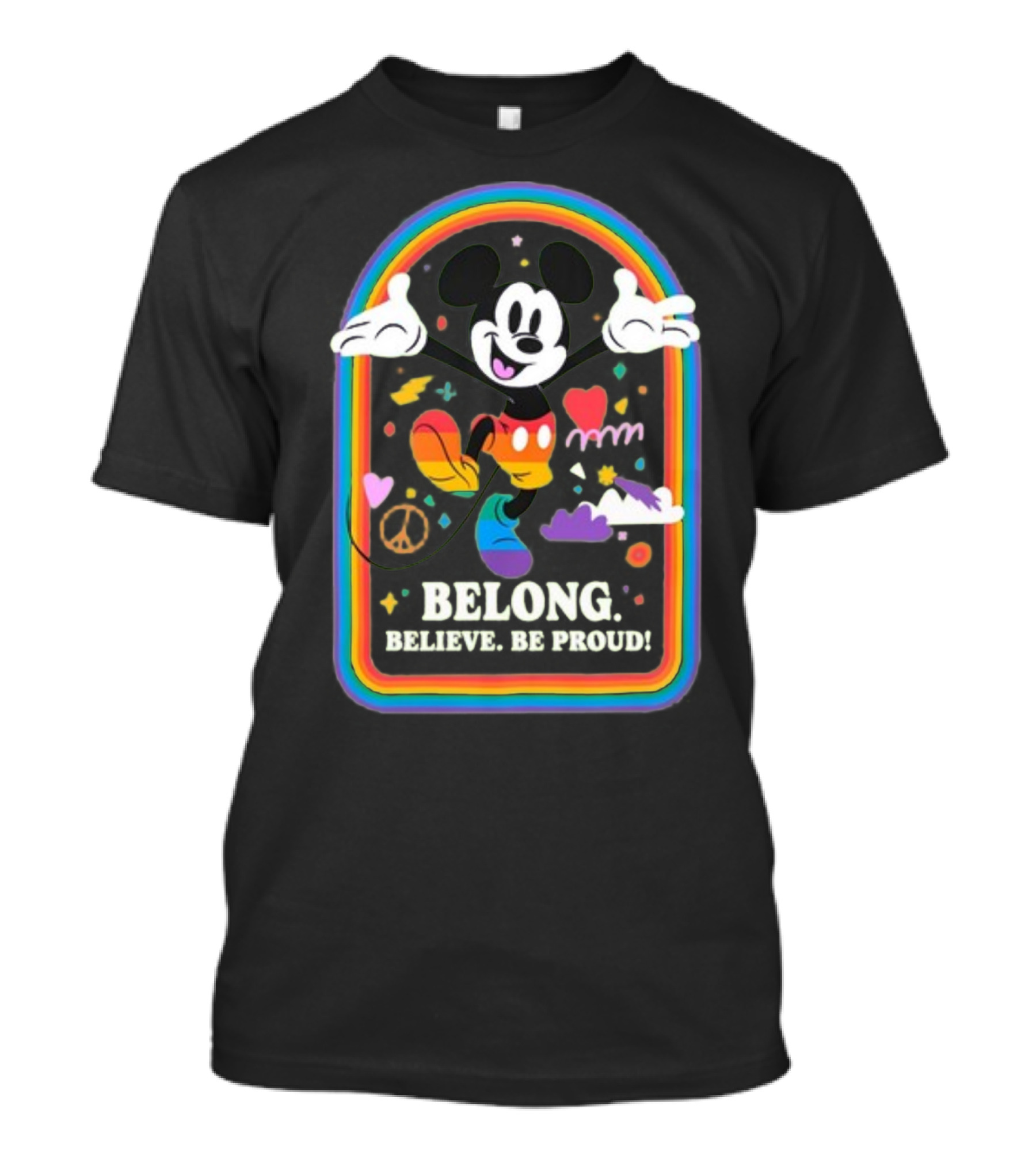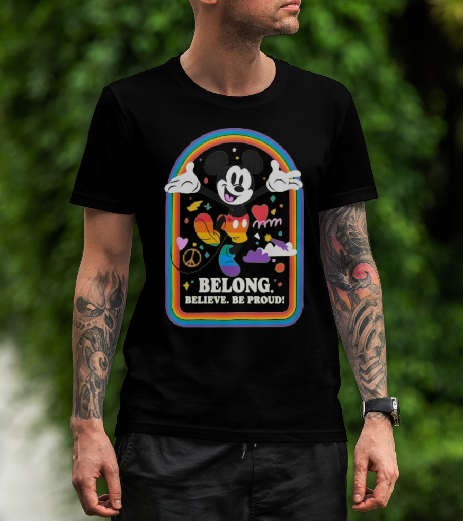 Belong Believe Be Proud Mickey Rainbow Peace Clouds Hearts T-Shirt