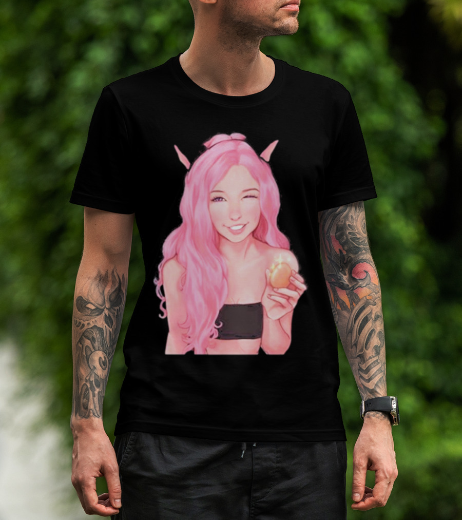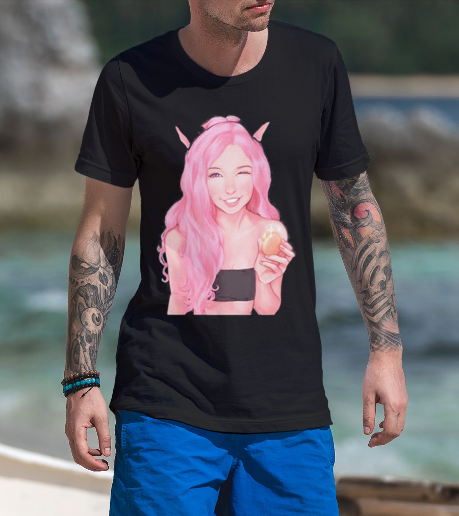 The Belle Delphine Pink Hair Winking Holding Golden Egg Fantasy T-shirt is designed for everyday wear and a consistent fit. Fabric is pre-shrunk ring-spun cotton with durable stitching. See the size chart below for exact measurements.