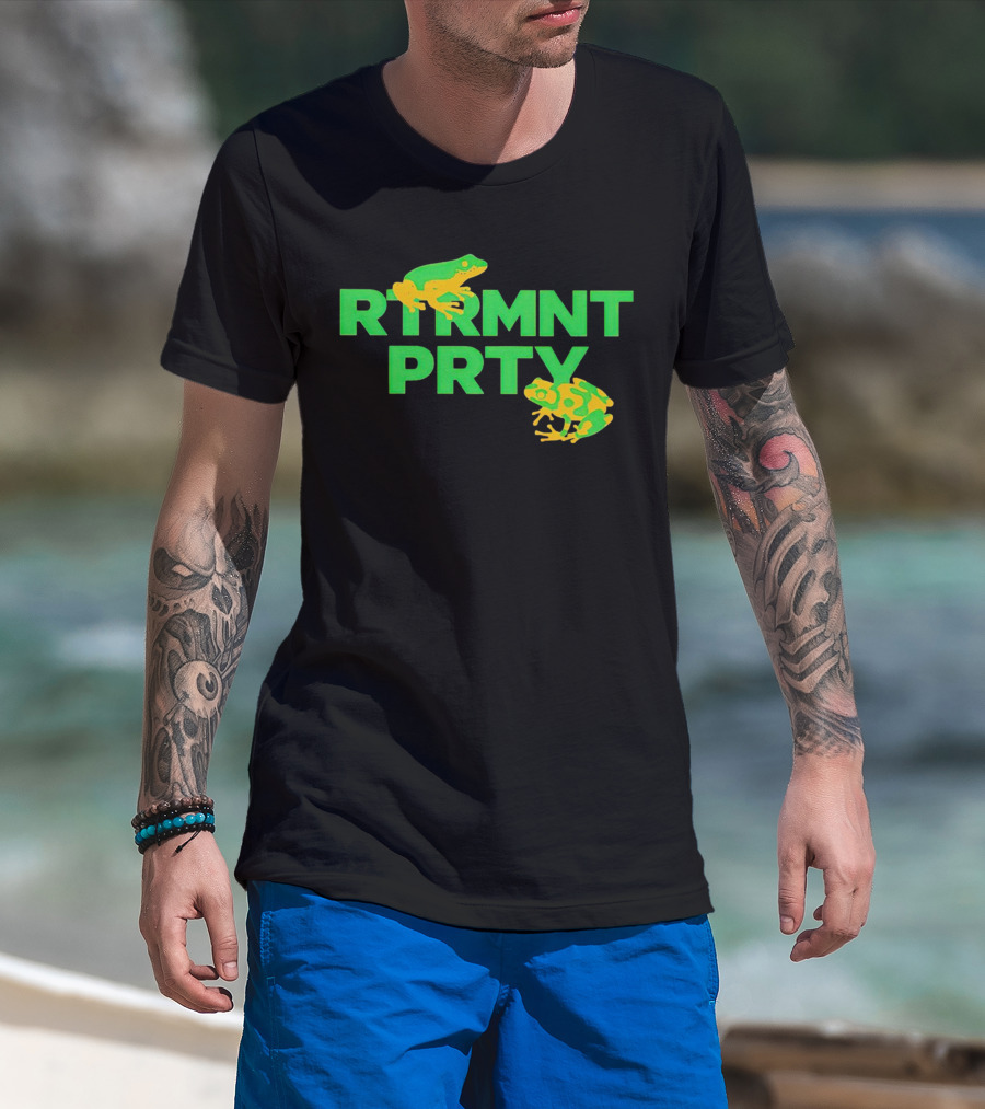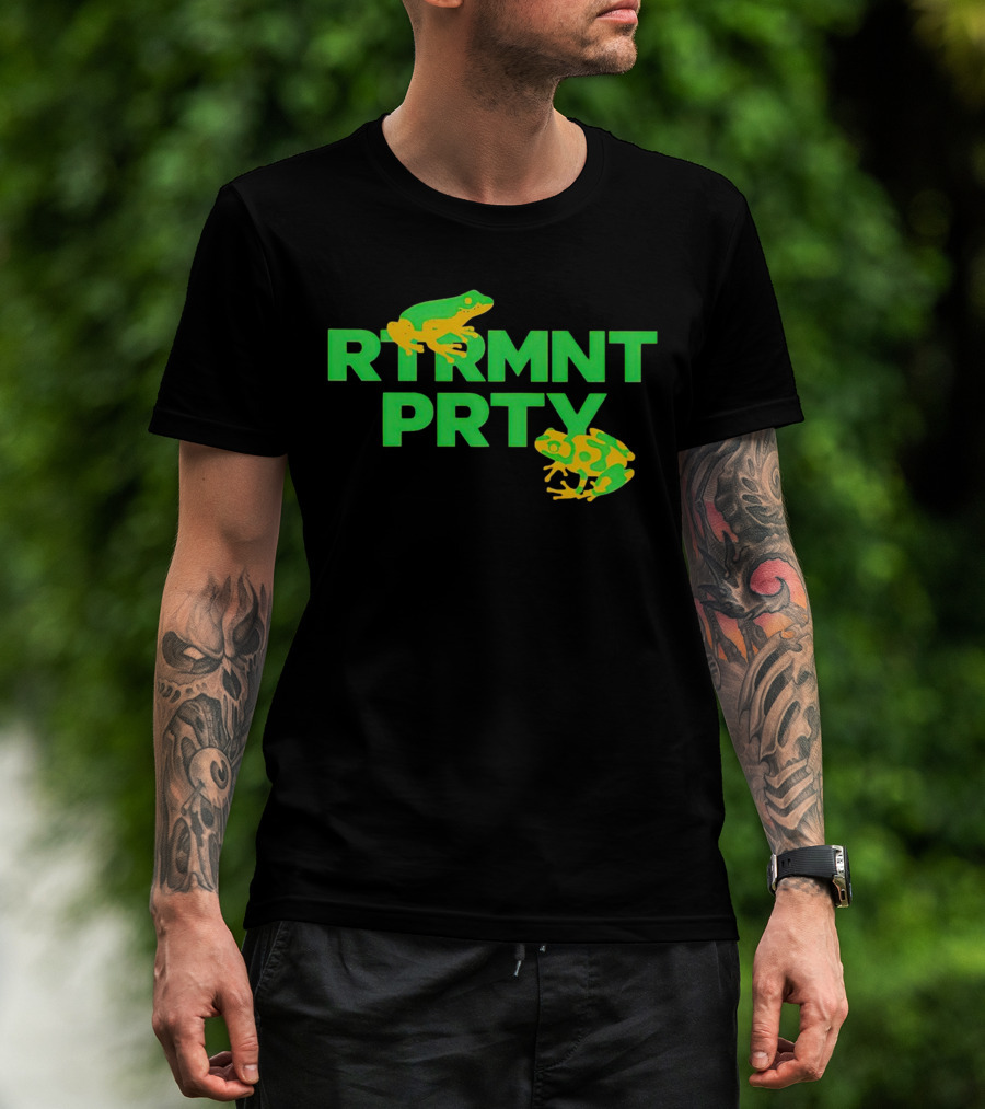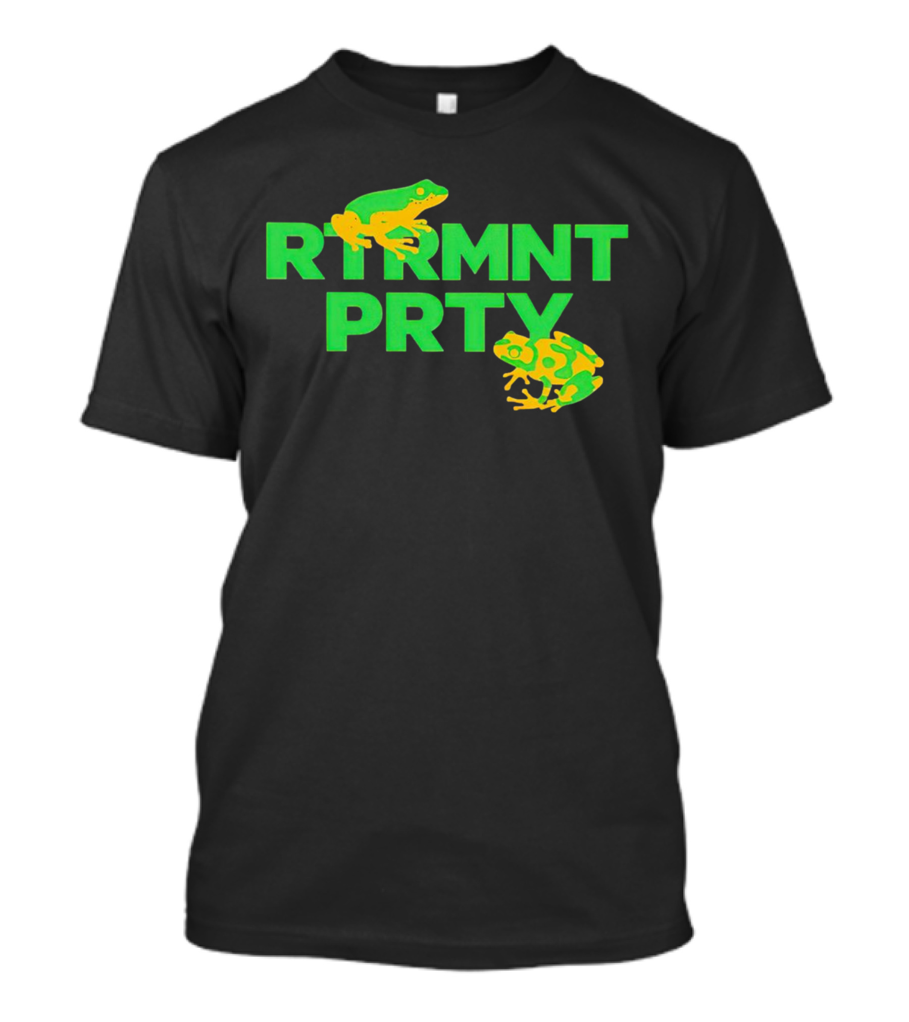 The Rtrmnt Prty with Green Frogs T-shirt is designed for everyday wear and a consistent fit. Fabric is pre-shrunk ring-spun cotton with durable stitching. See the size chart below for exact measurements.