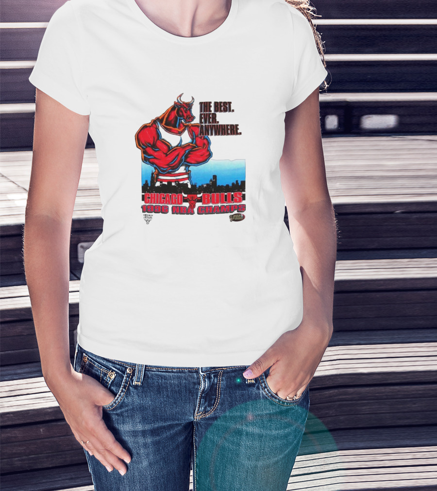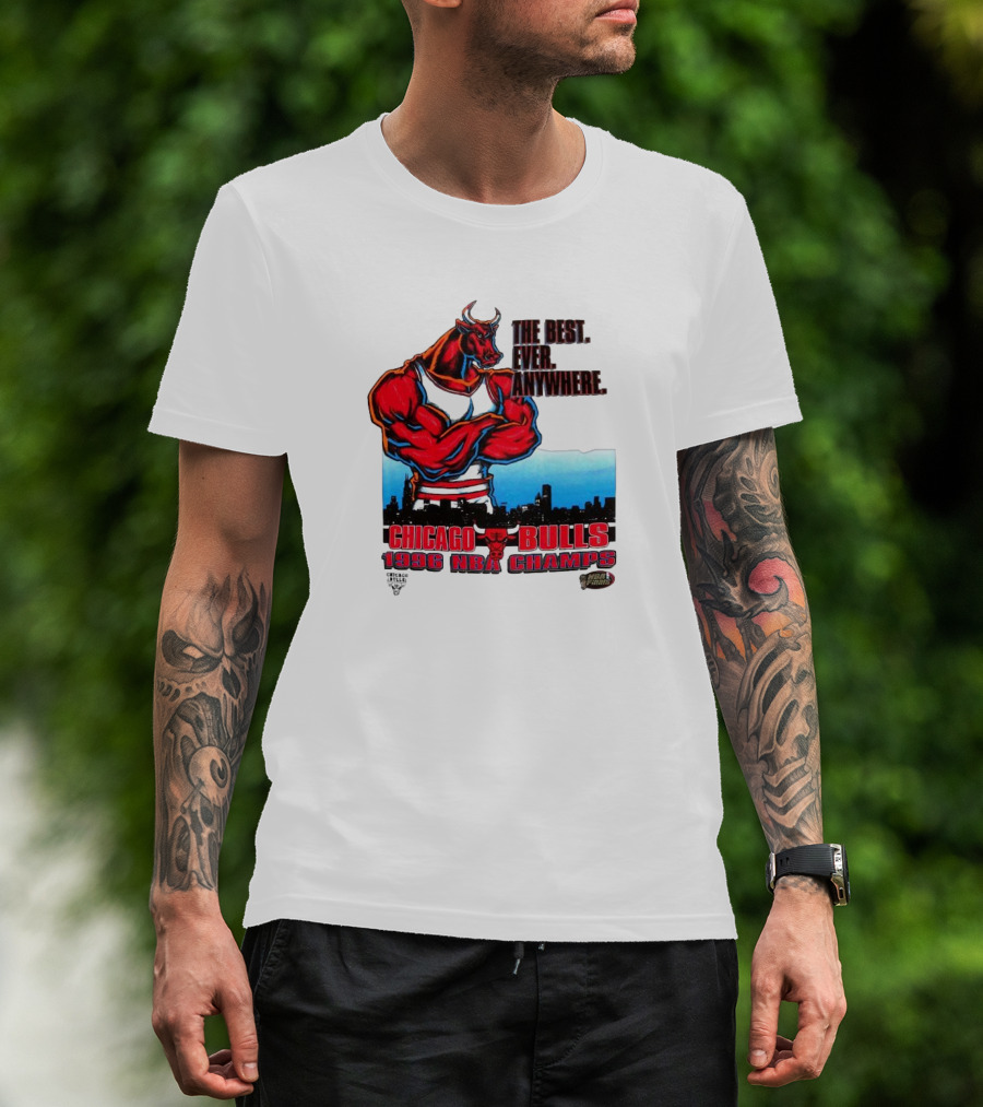 The Chicago Bulls 1996 NBA Champs The Best Ever Anywhere Bulls United Center Skyline T-shirt is designed for everyday wear and a consistent fit. Fabric is pre-shrunk ring-spun cotton with durable stitching. See the size chart below for exact measurements.