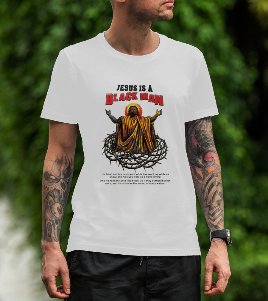 The Jesus Is a Black Man Surrounded by Crown of Thorns with Revelations Reference T-shirt is designed for everyday wear and a consistent fit. Fabric is pre-shrunk ring-spun cotton with durable stitching. See the size chart below for exact measurements.