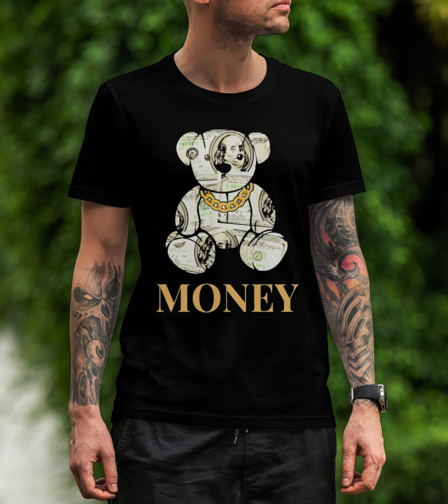 The Money Dollar Bear with Gold Chain T-shirt is designed for everyday wear and a consistent fit. Fabric is pre-shrunk ring-spun cotton with durable stitching. See the size chart below for exact measurements.