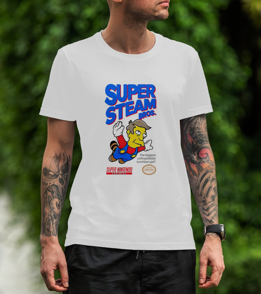 The Super Steam Bros Super Nintendo Exercise Lunch Jeff T-shirt is designed for everyday wear and a consistent fit. Fabric is pre-shrunk ring-spun cotton with durable stitching. See the size chart below for exact measurements.