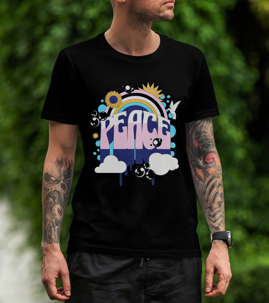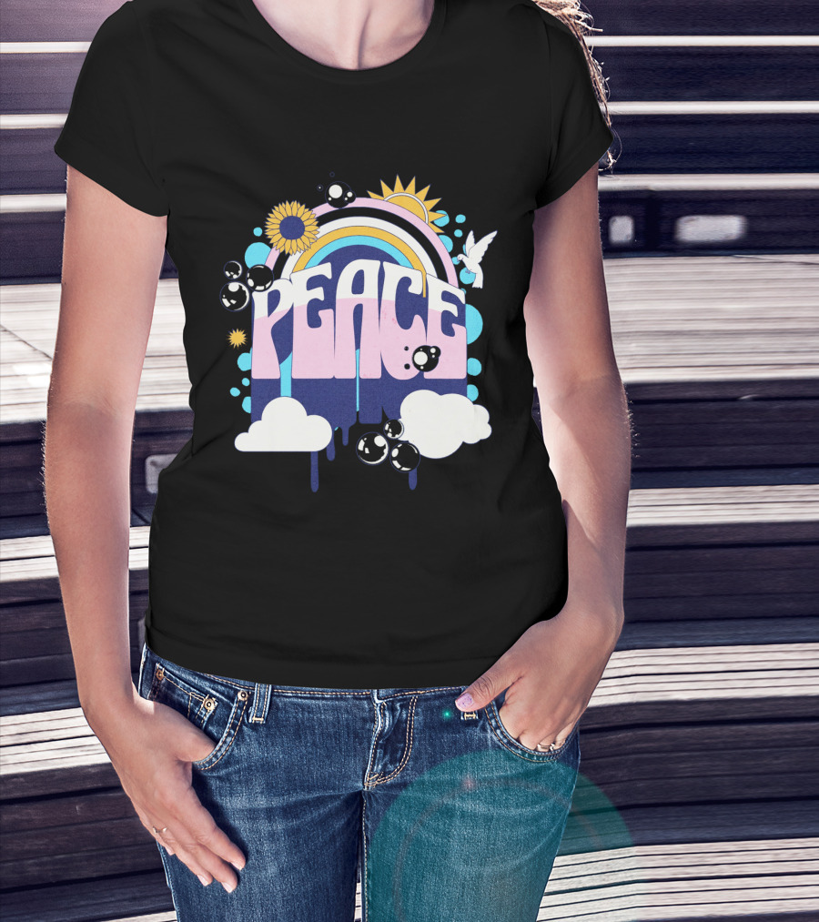 The Peace Colorful Rainbow Sunflower Clouds Dove and Good Vibes T-shirt is designed for everyday wear and a consistent fit. Fabric is pre-shrunk ring-spun cotton with durable stitching. See the size chart below for exact measurements.