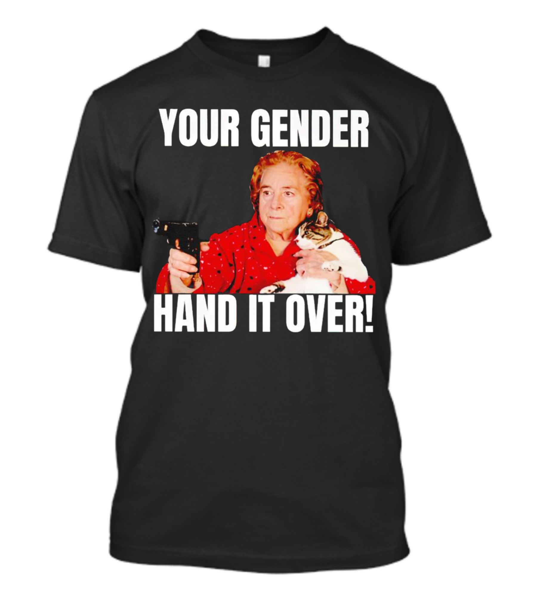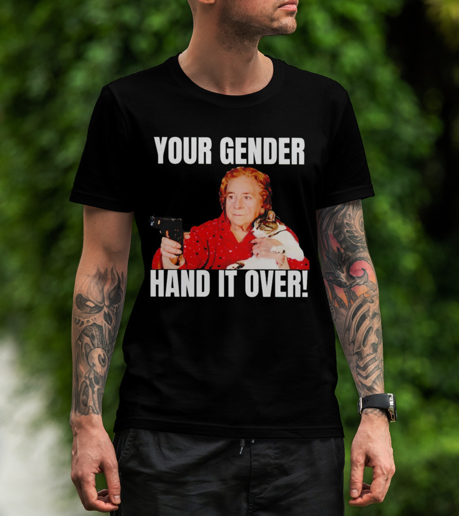 YOUR GENDER HAND IT OVER WITH WOMAN HOLDING CAT AND PISTOL T-Shirt