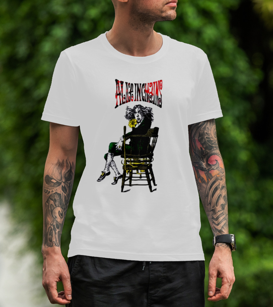 The Alice in Chains Angry Chair Artwork with Striking Figure on Dark Background 1992 T-shirt is designed for everyday wear and a consistent fit. Fabric is pre-shrunk ring-spun cotton with durable stitching. See the size chart below for exact measurements.